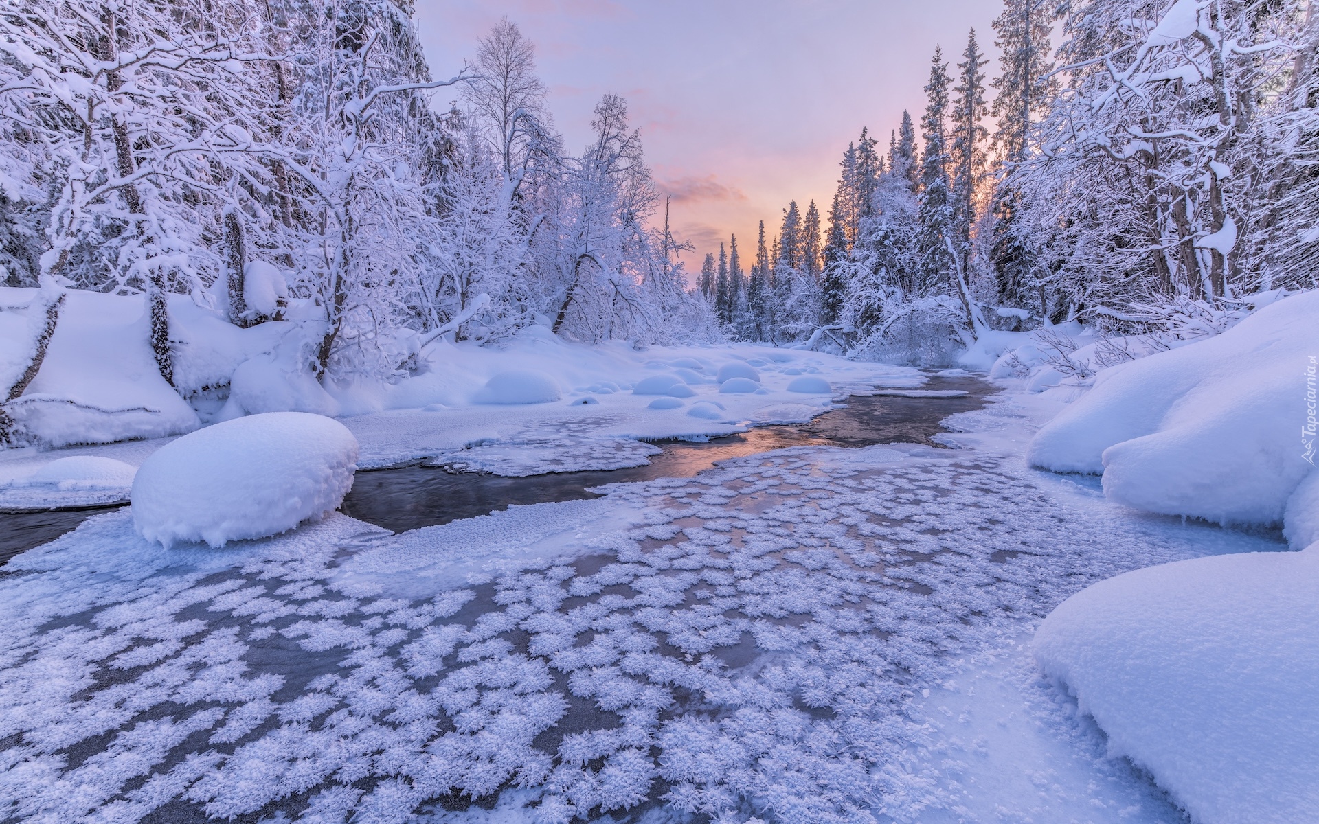 Edytor tapety: Oblodzona rzeka i ośnieżone drzewa