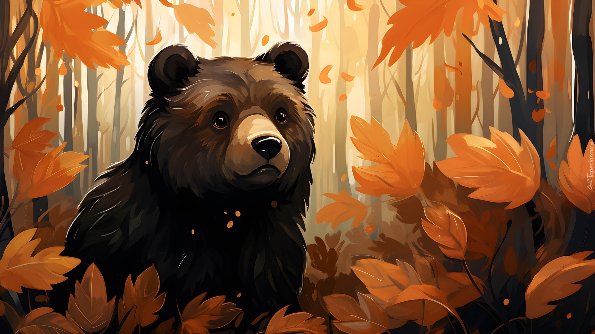 Edytor tapety: Niedźwiedź wśród jesiennych liści w lesie