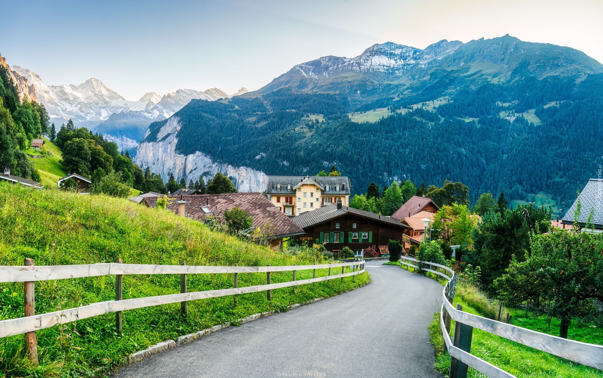 Edytor tapety: Ogrodzona droga do wsi Wengen w Alpach Berneńskich