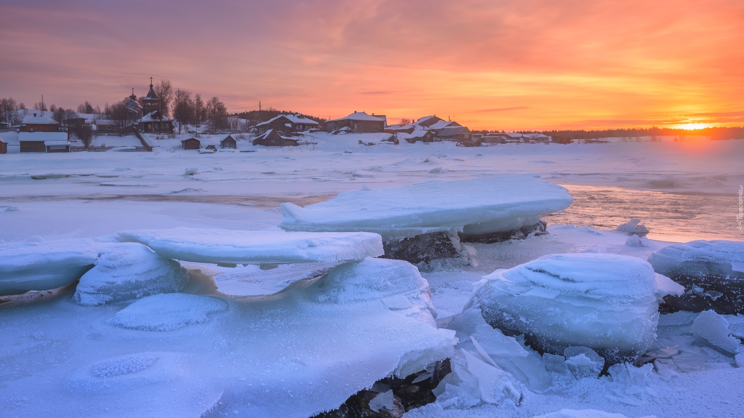 Edytor tapety: Oblodzona rzeka w blasku zachodzącego słońca