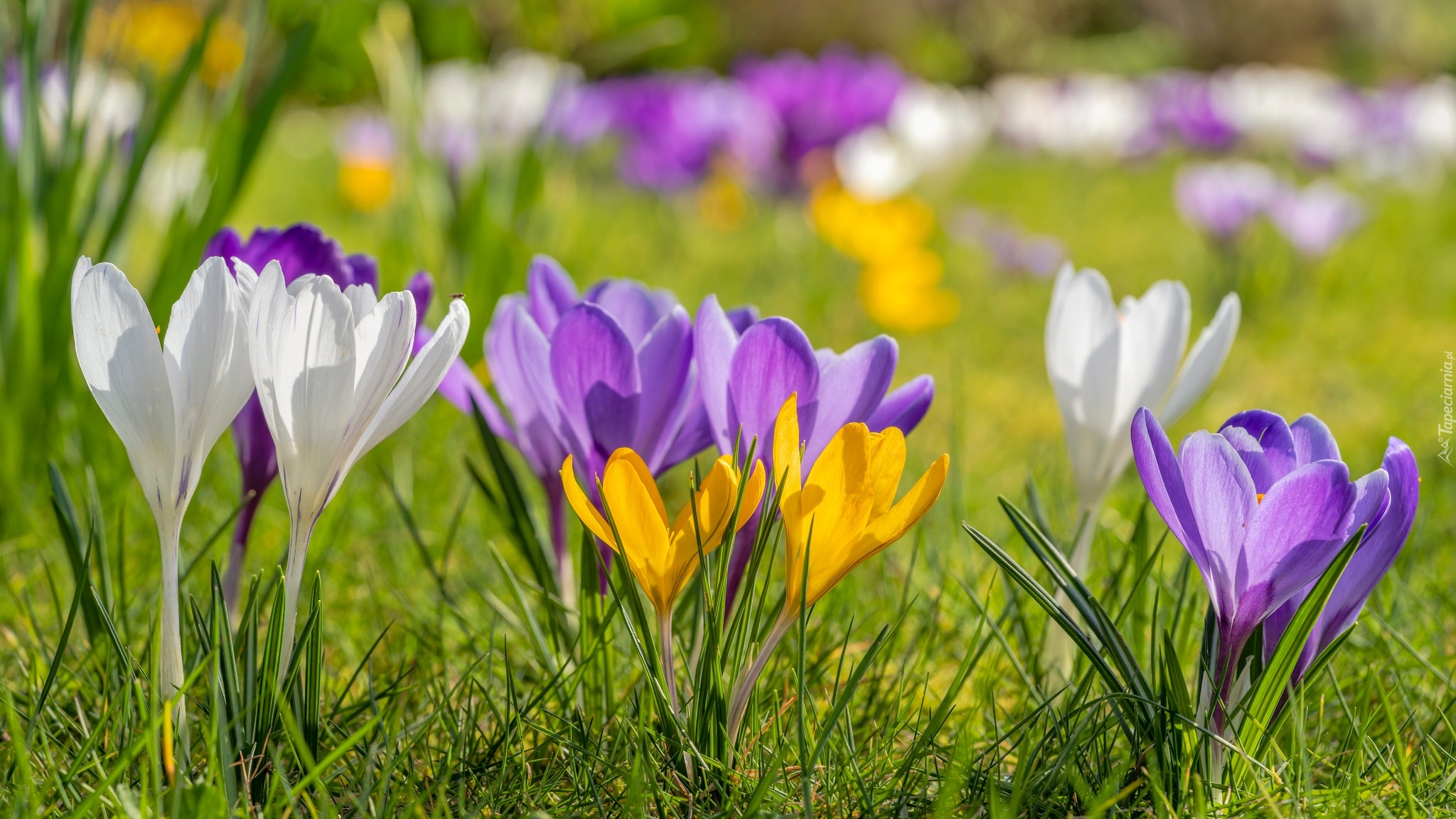 Edytor tapety: Rozświetlone kolorowe krokusy w trawie