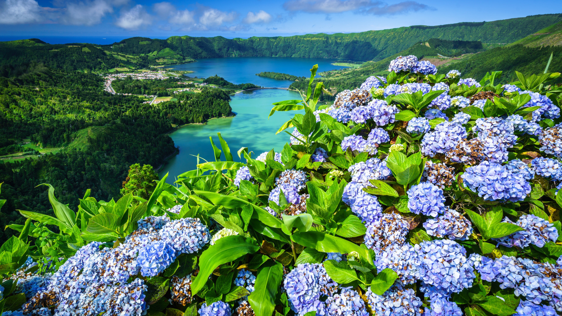 Edytor tapety: Hortensje na tle jezior w Portugalii