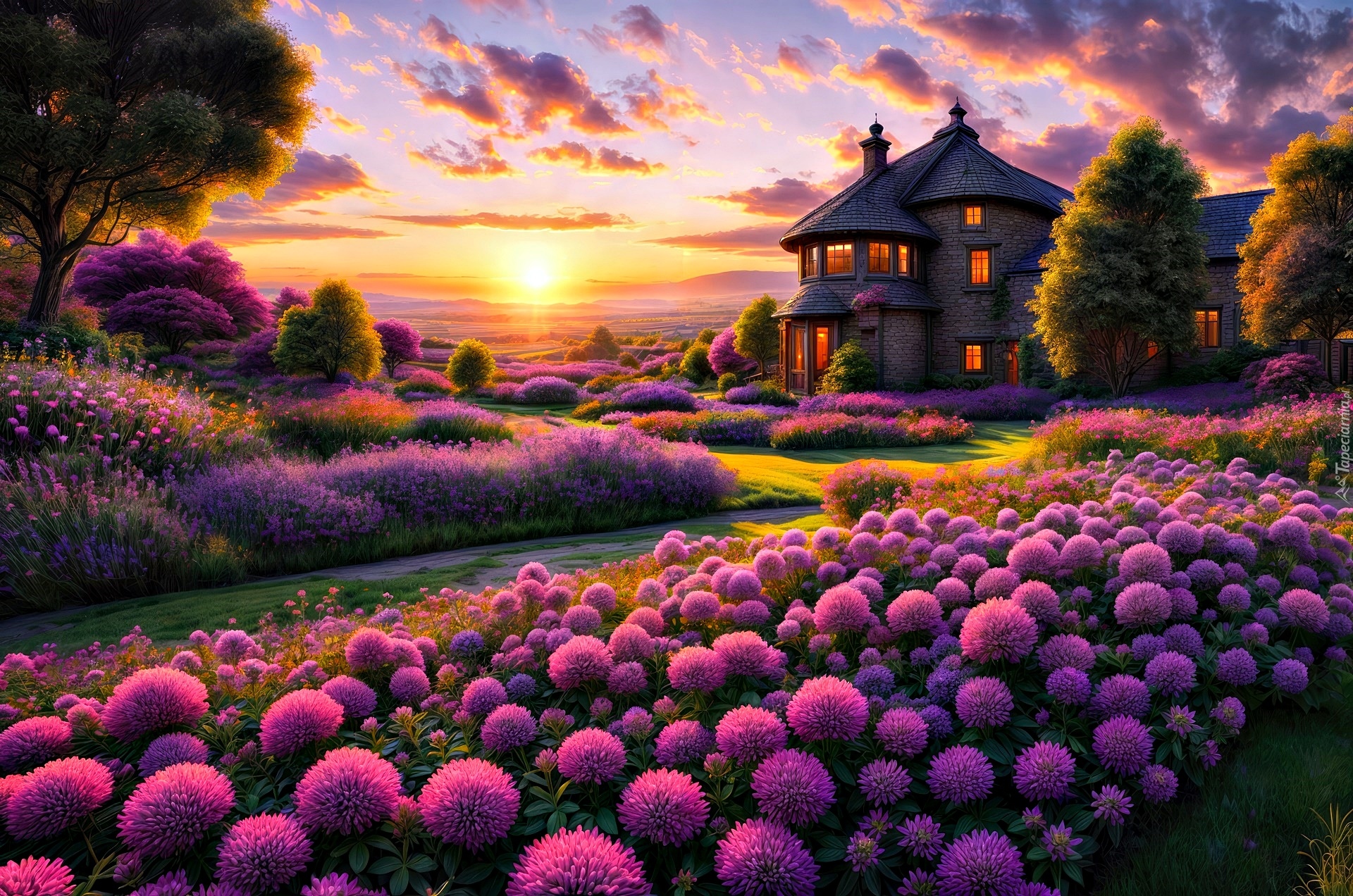 Edytor tapety: Fioletowe kwiaty przed domem w blasku zachodzącego słońca