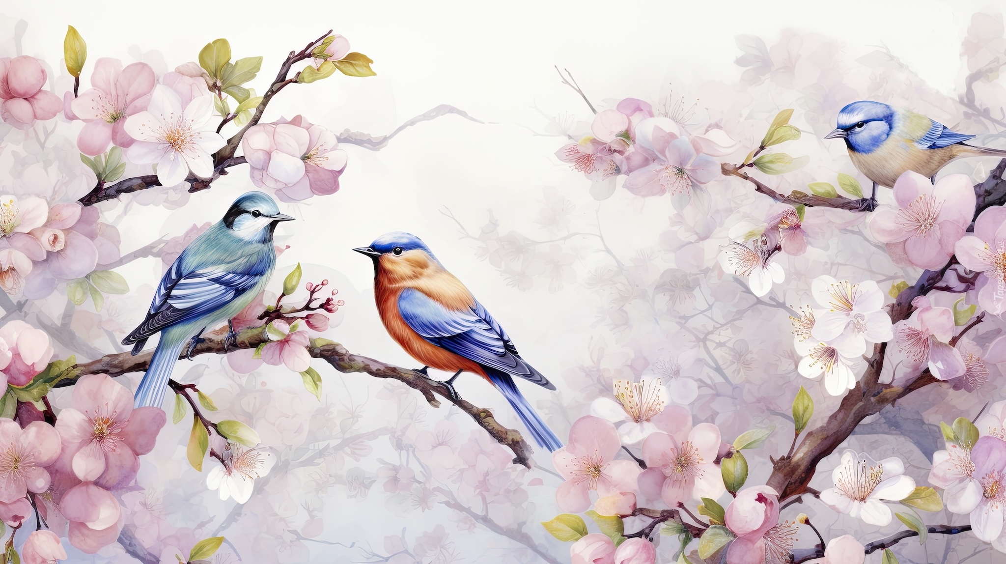 Edytor tapety: Trzy ptaszki na ukwieconych gałązkach
