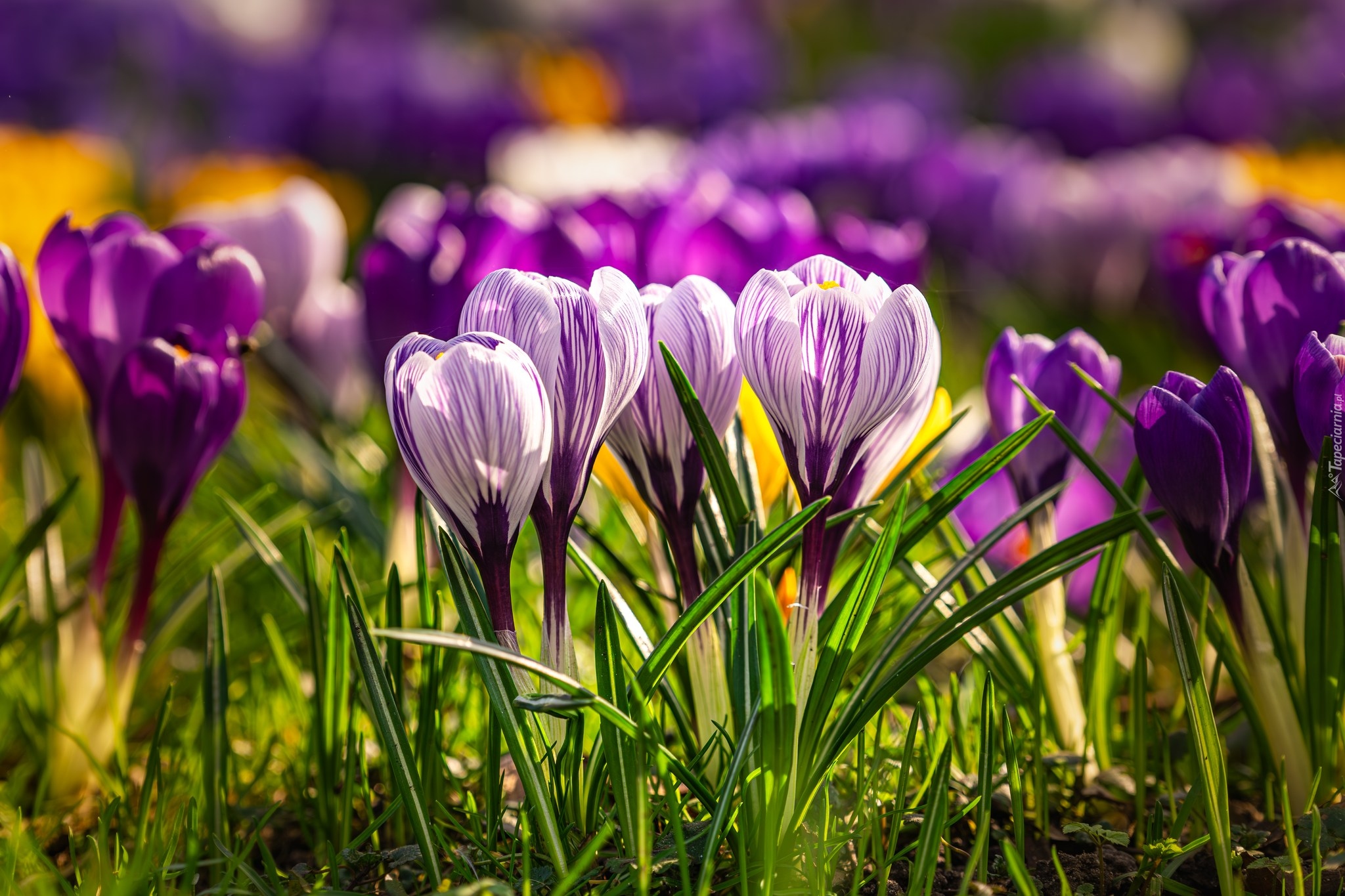 Edytor tapety: Liliowe i fioletowe krokusy w trawie