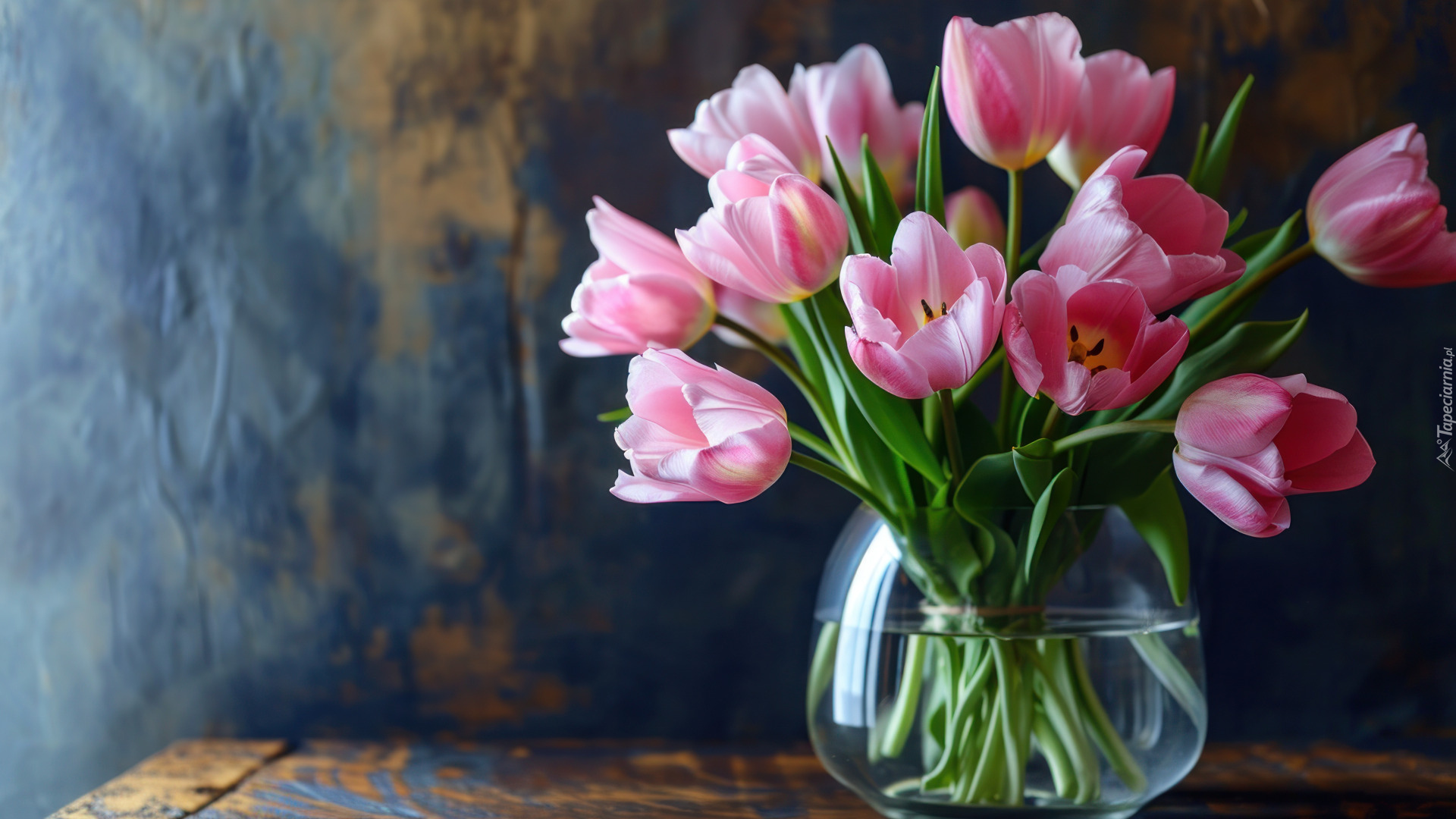 Edytor tapety: Rozświetlony bukiet różowych tulipanów w wazonie