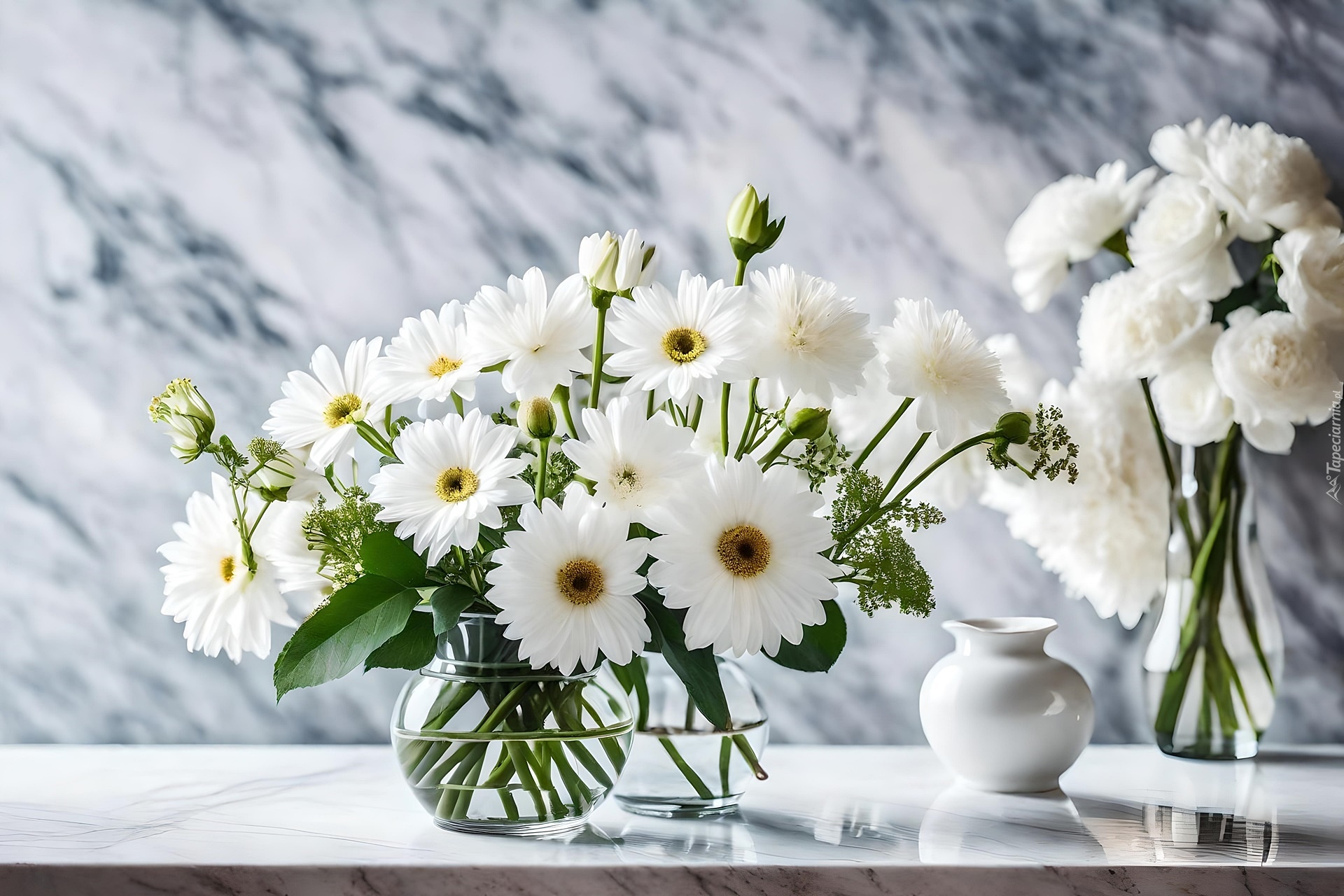 Edytor tapety: Białe kwiatki w szklanych wazonach