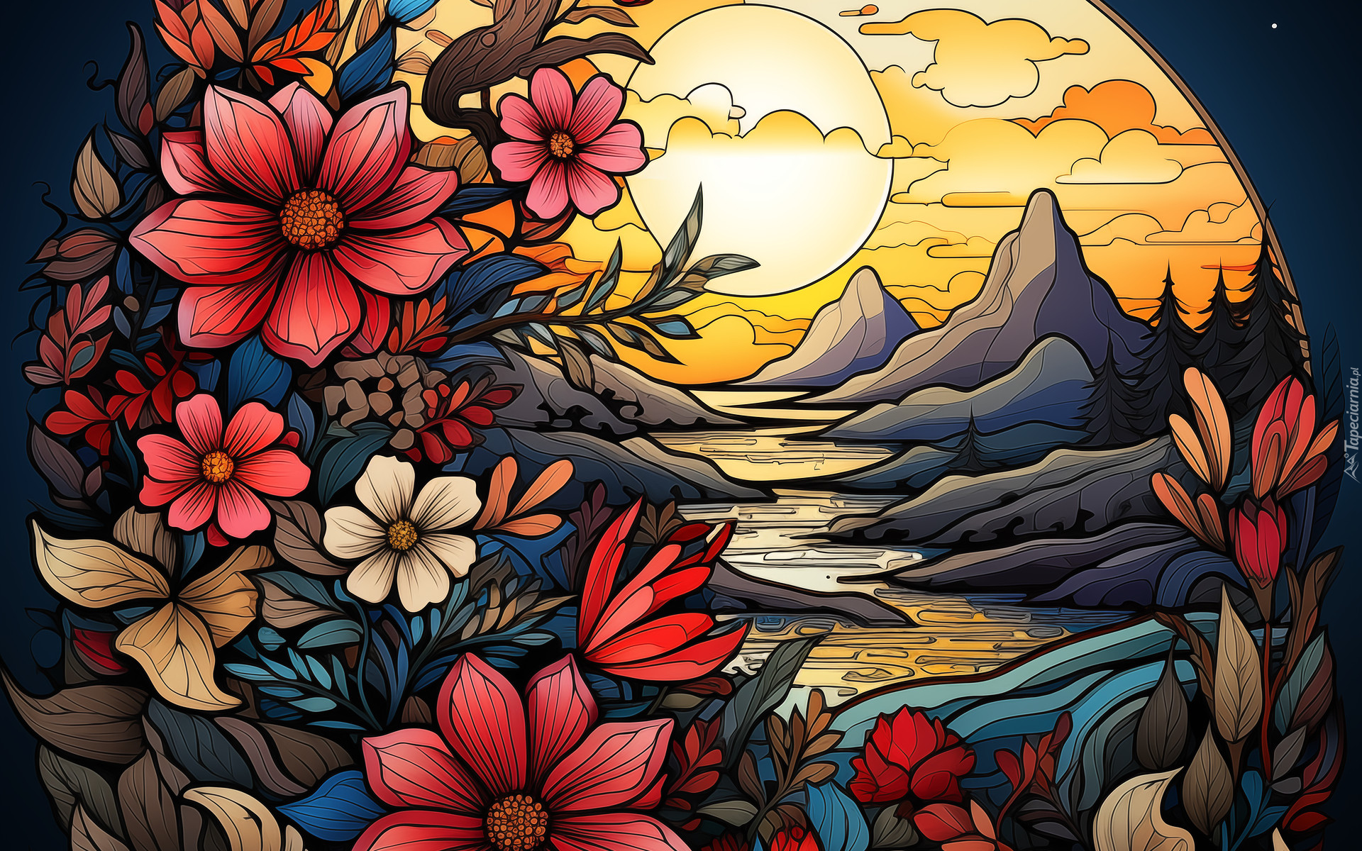 Edytor tapety: Grafika z kwiatami na tle górskiego krajobrazu