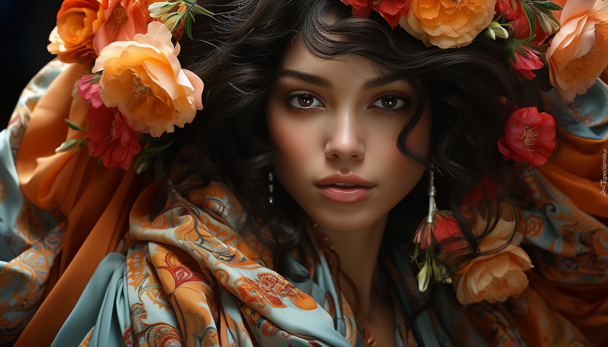 Edytor tapety: Szatynka w kolorowym szalu i kwiatami we włosach