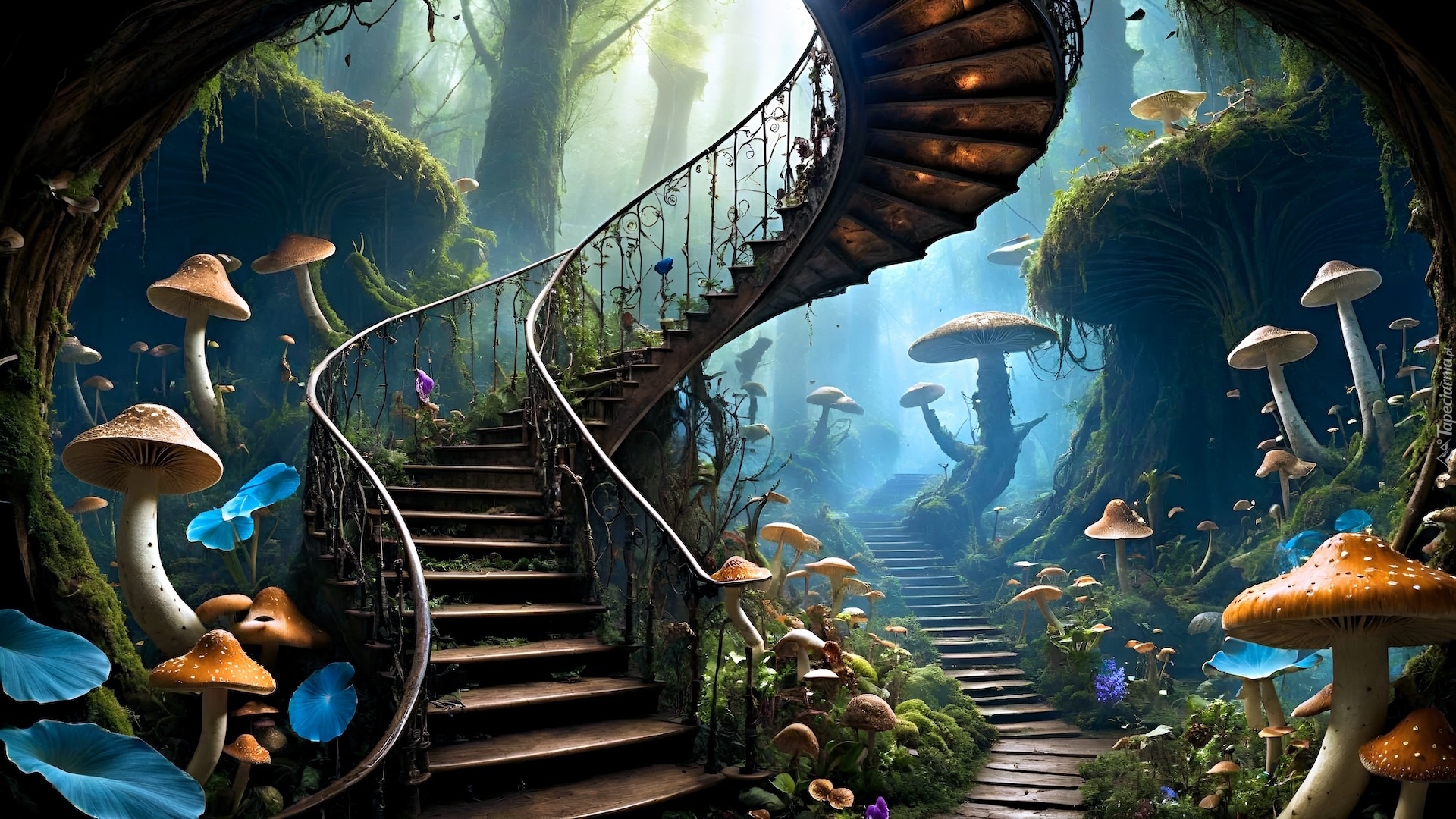Edytor tapety: Grzyby obok schodów w magicznym lesie