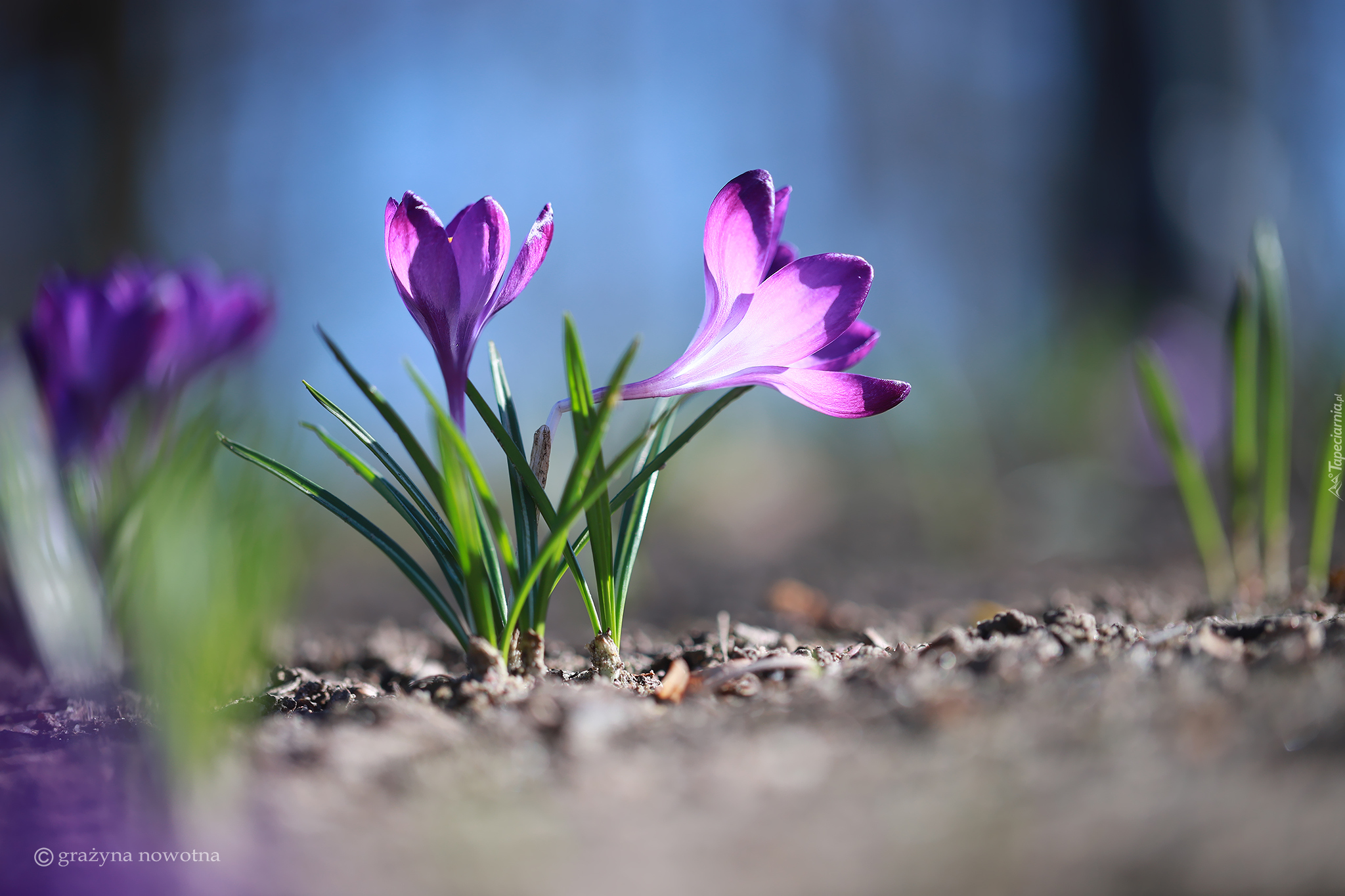Edytor tapety: Kępka rozkwitających fioletowych krokusów w słonecznym blasku