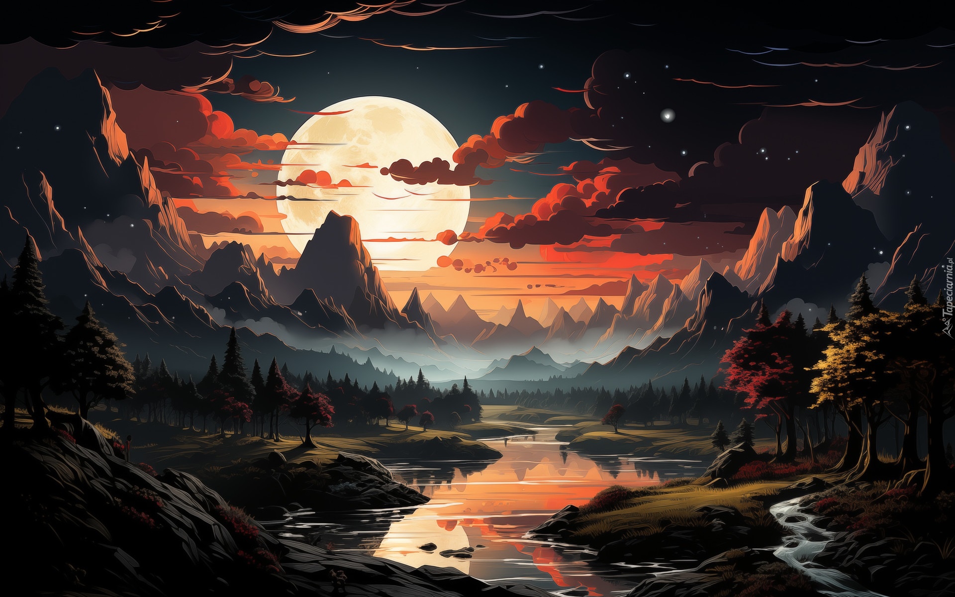 Edytor tapety: Księżyc w pełni nad górami i rzeką