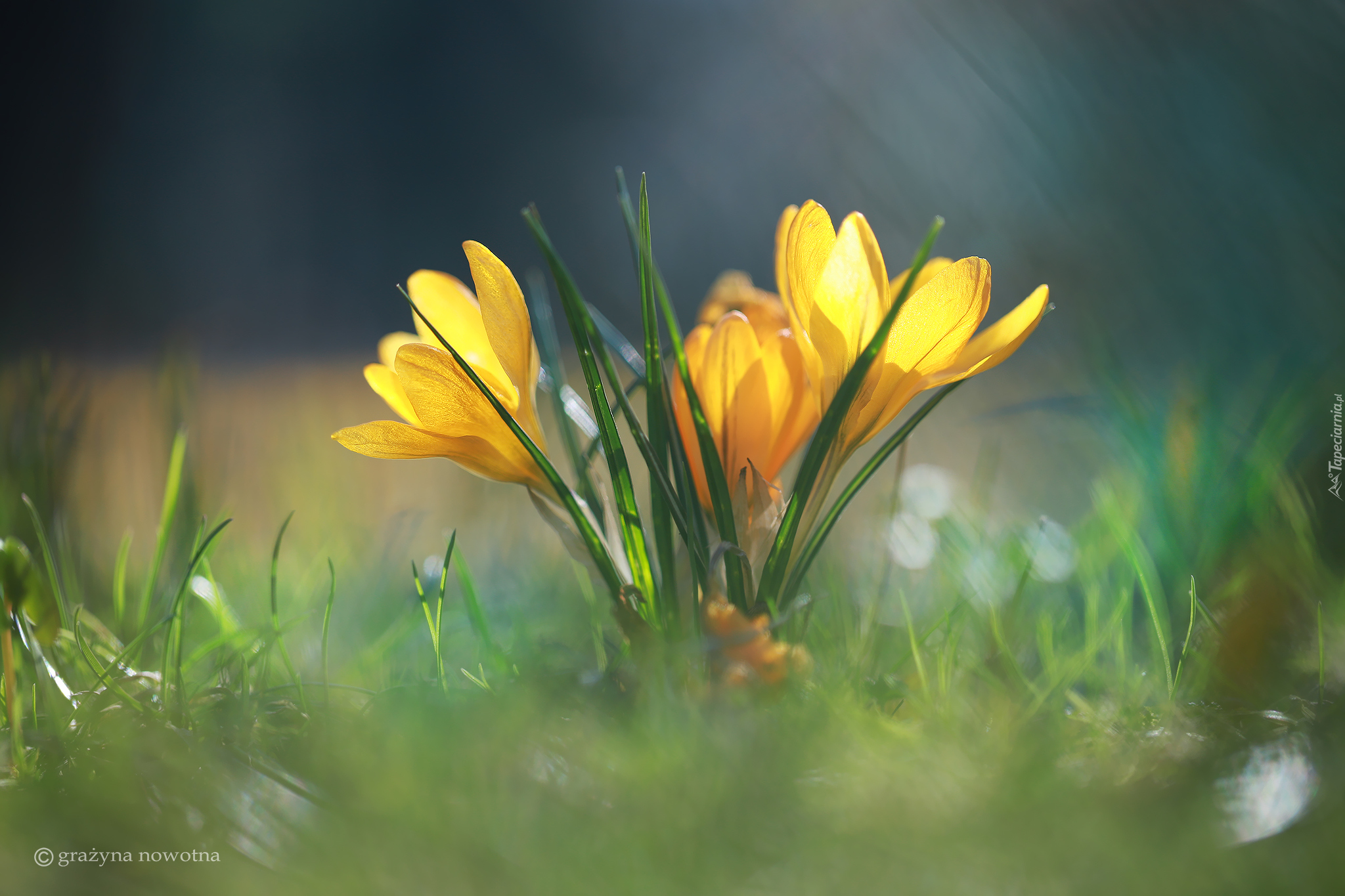 Edytor tapety: Żółte rozświetlone krokusy w trawie