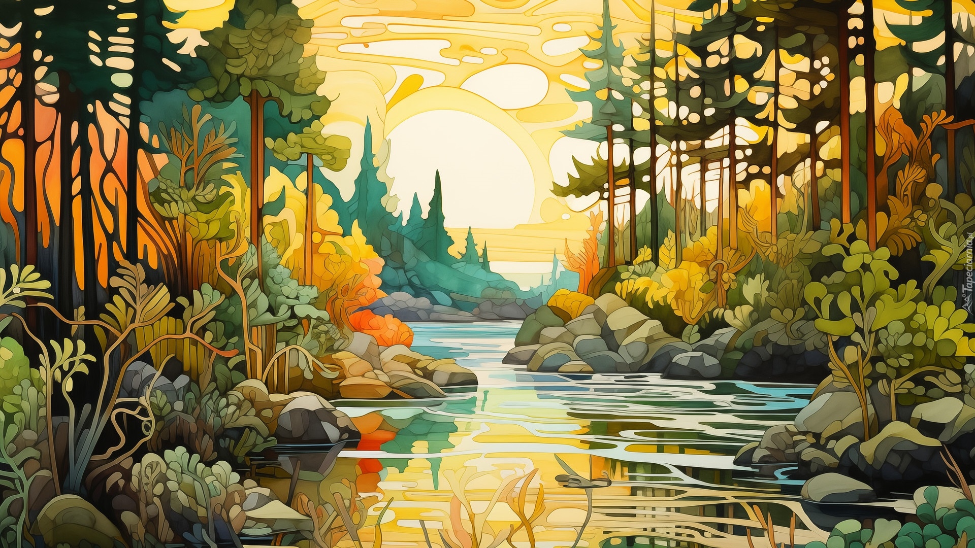 Edytor tapety: Drzewa i kamienie nad rzeką w grafice 2D