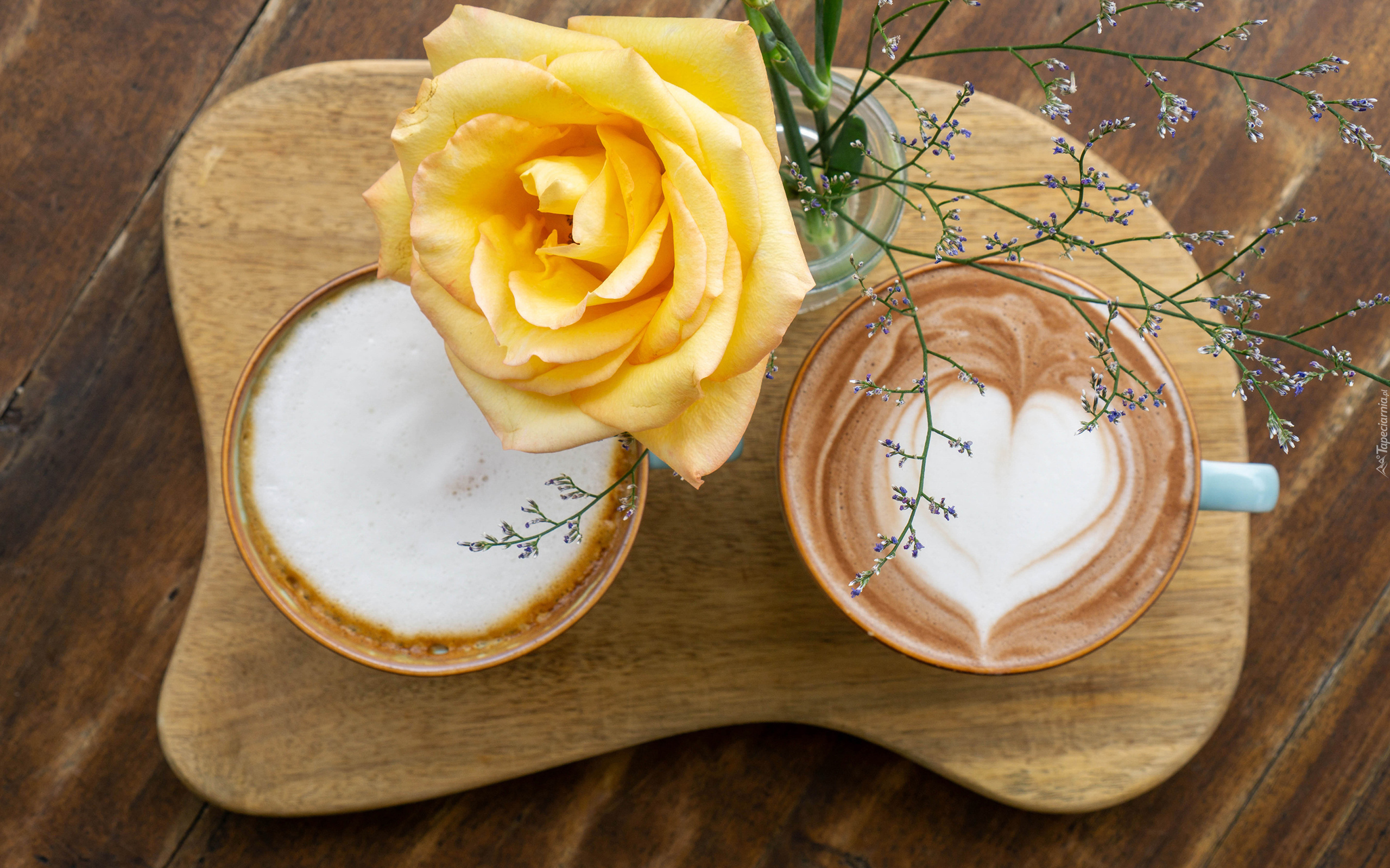 Edytor tapety: Żółta róża w wazoniku obok cappuccino na tacy