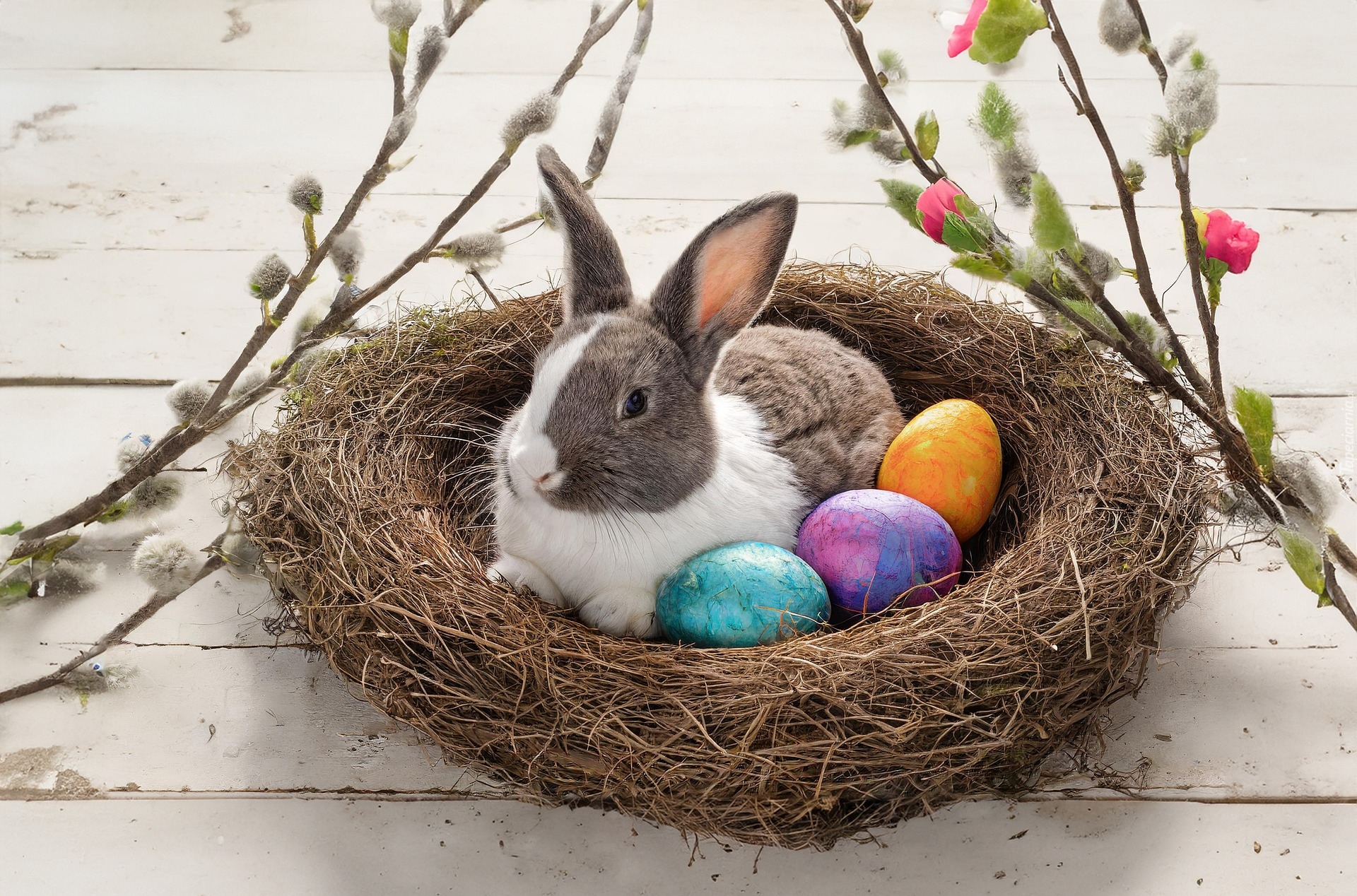 Edytor tapety: Siedzący królik w gnieździe z pisankami