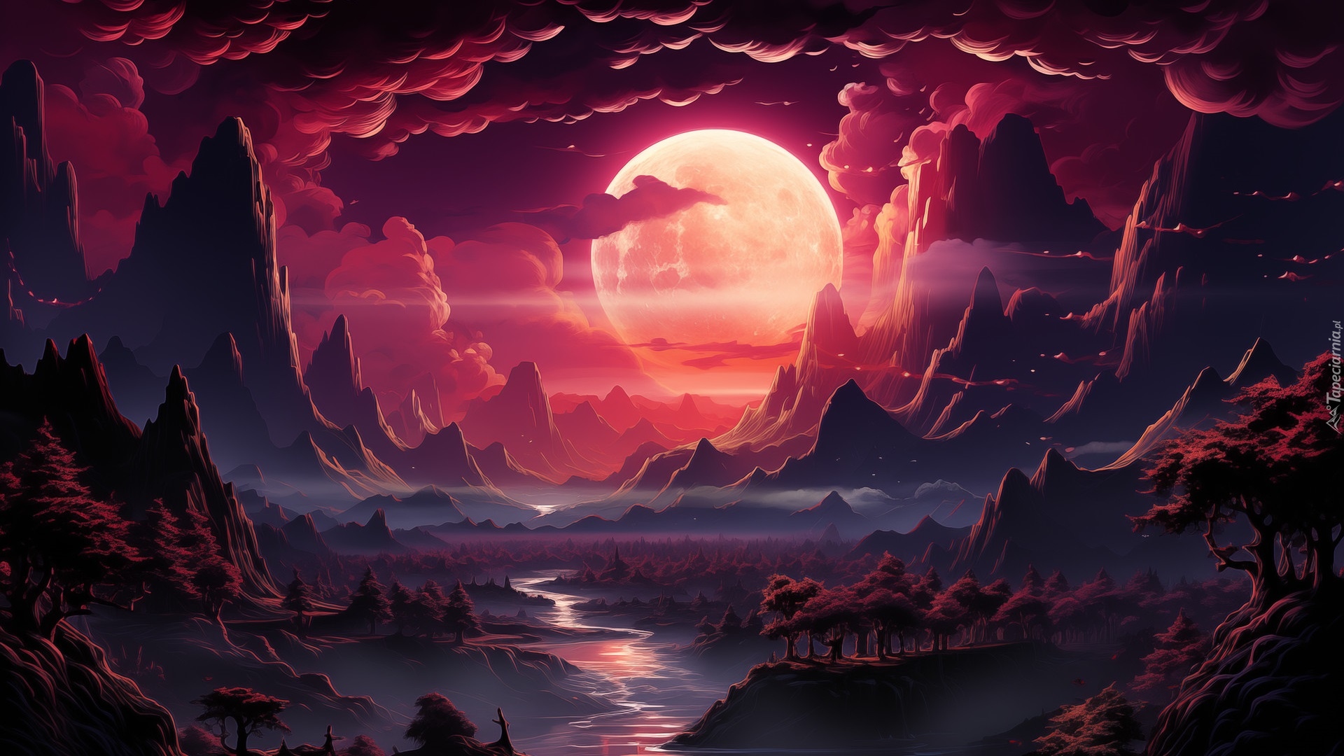 Edytor tapety: Księżyc i chmury nad górami i rzeką
