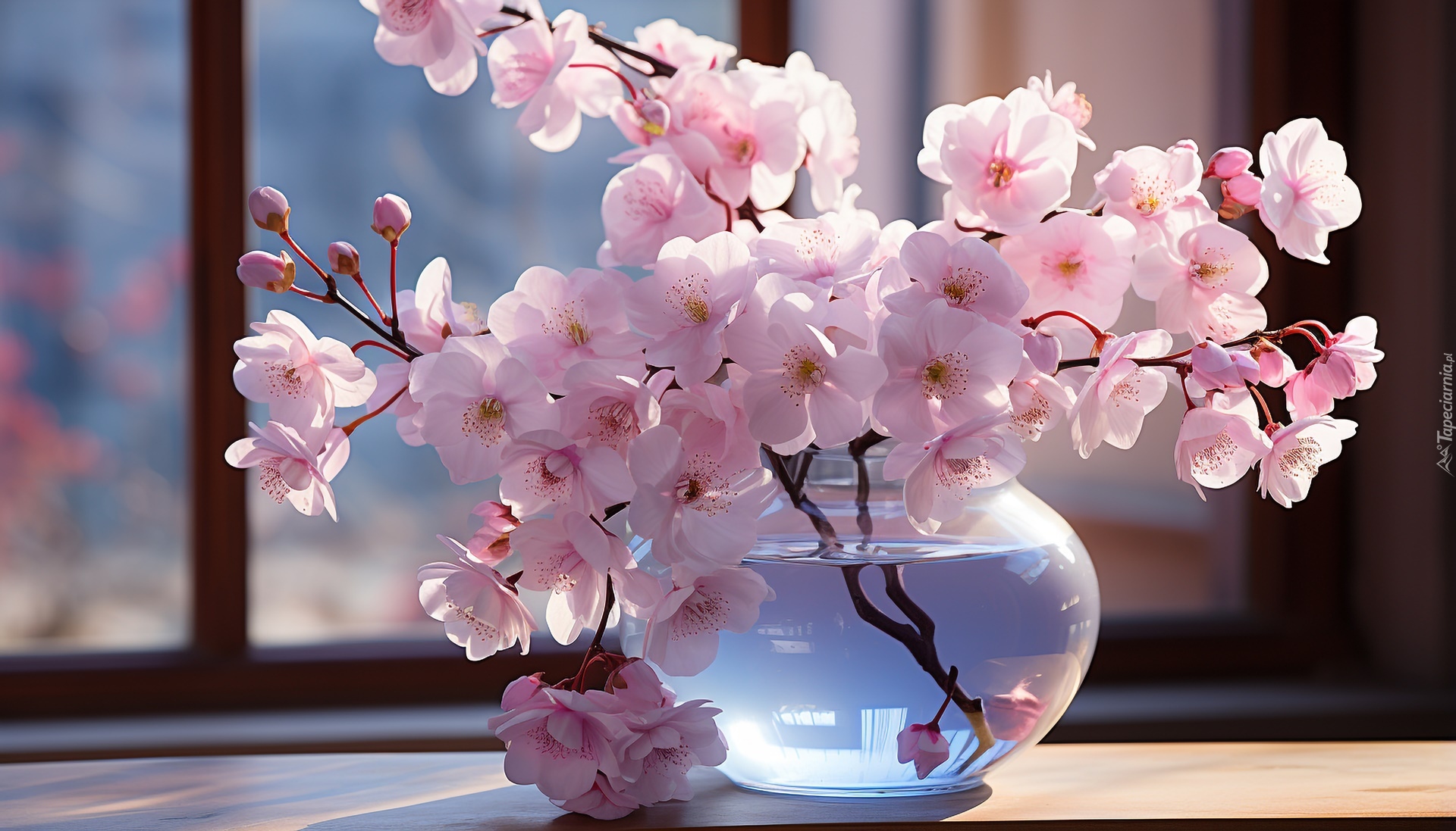 Edytor tapety: Gałązki z kwiatami drzewa owocowego w szklanym wazonie