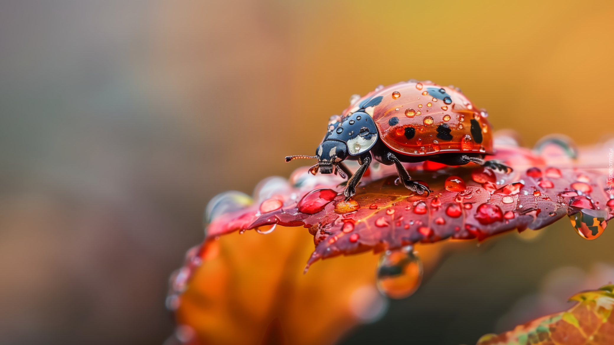 Edytor tapety: Mokra biedronka na mokrym jesiennym liściu