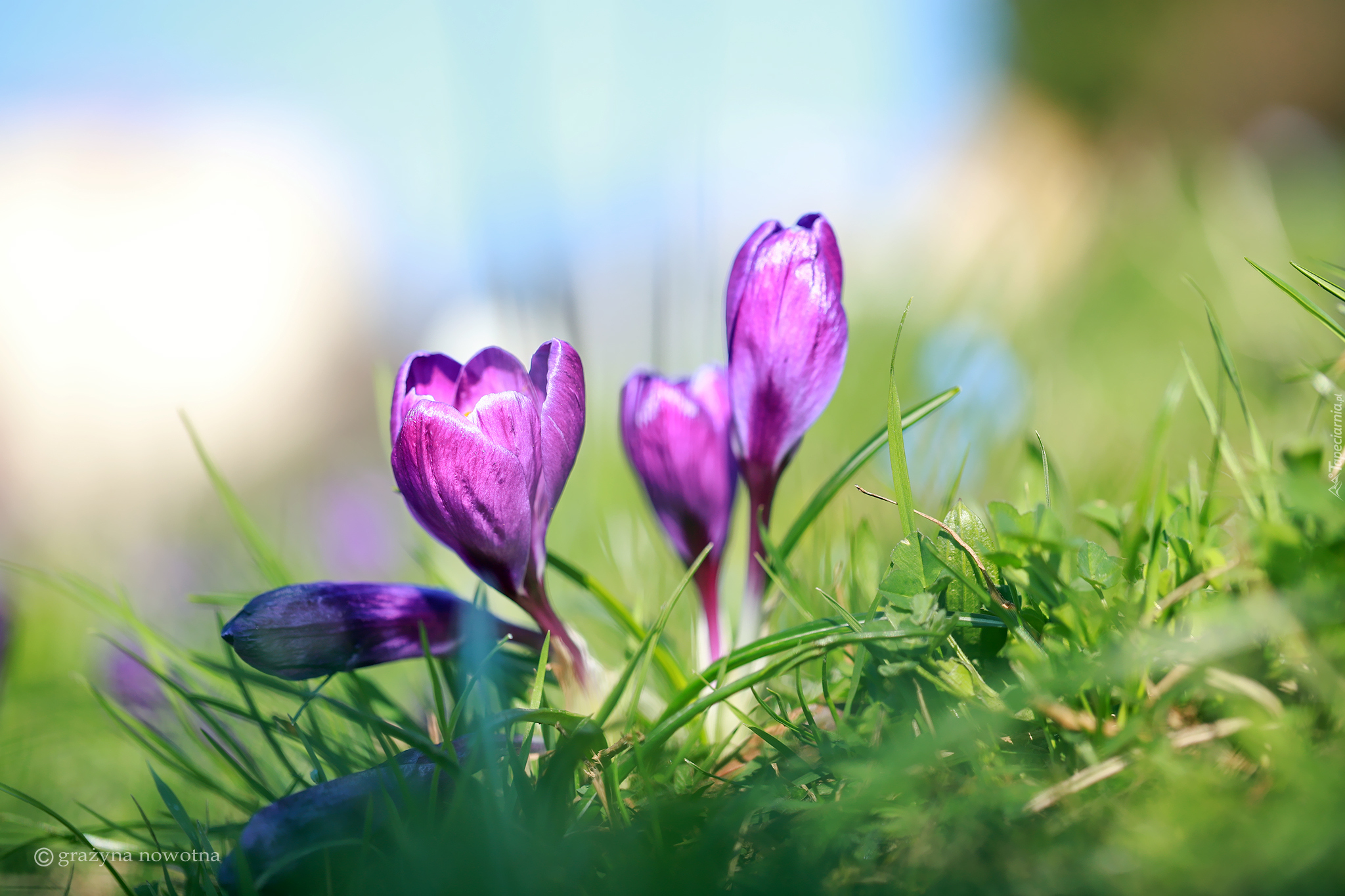 Edytor tapety: Rozkwitające fioletowe krokusy w słonecznym blasku