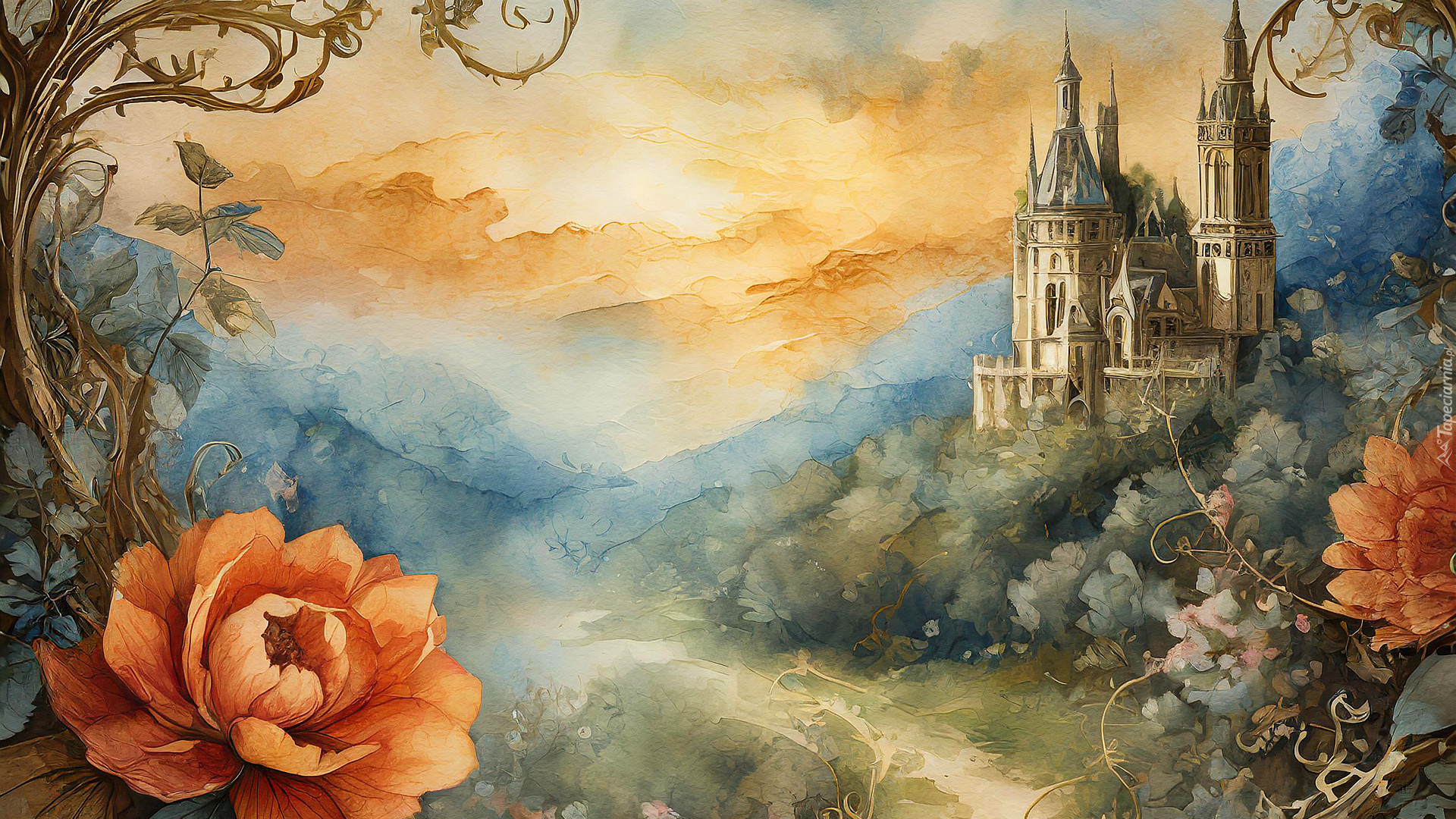 Edytor tapety: Kwiaty i zamek w górach w malarstwie
