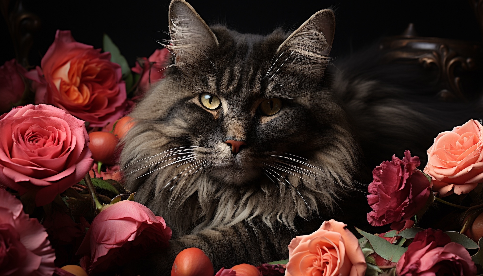 Edytor tapety: Puszysty ciemny kot wśród róż