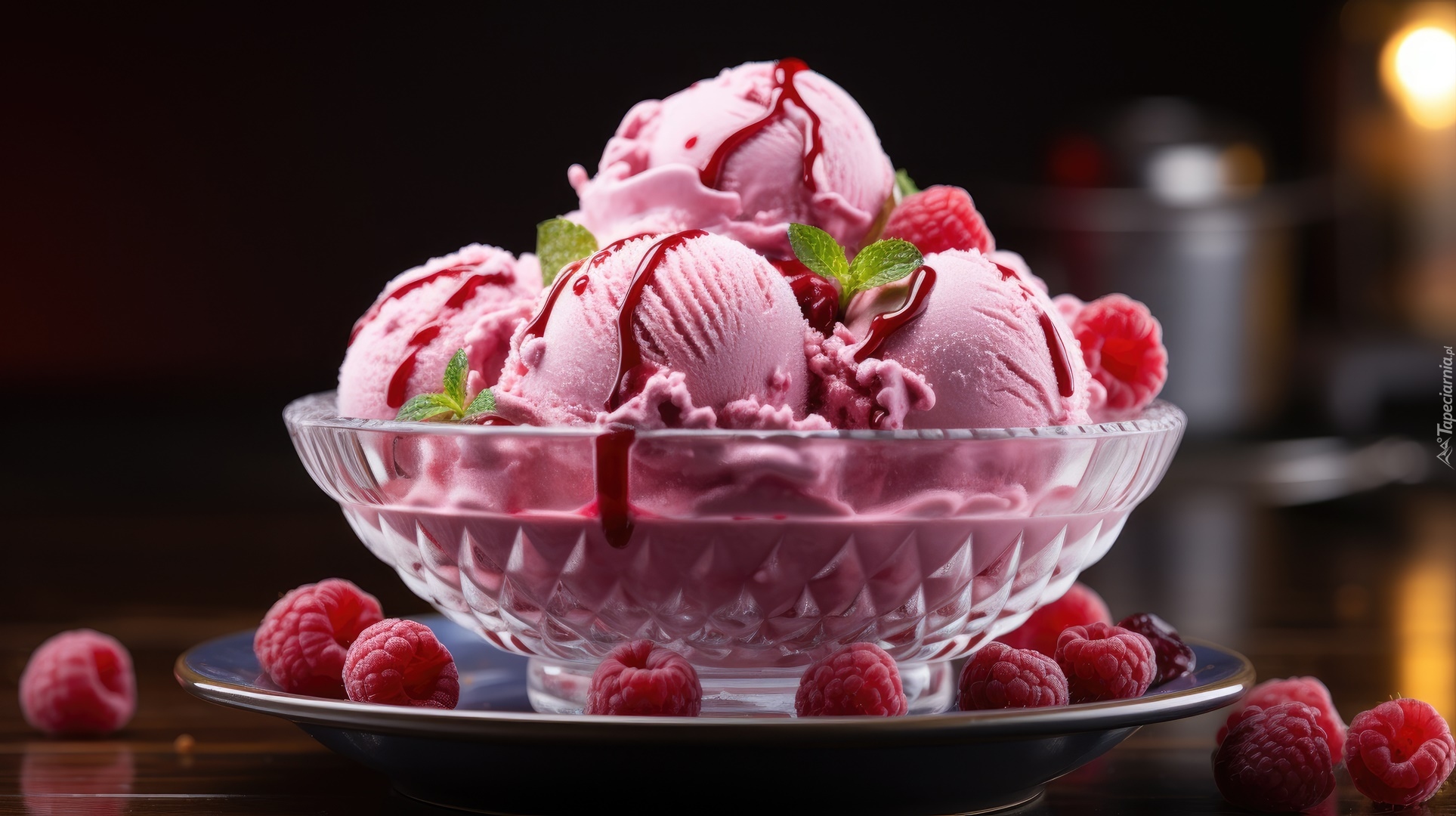 Edytor tapety: Malinowe lody z polewą w miseczce