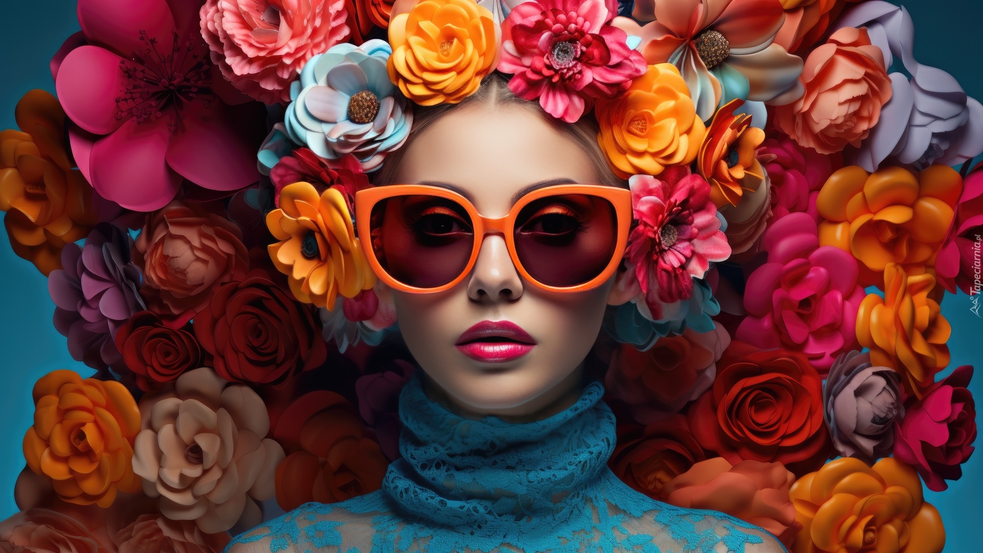 Edytor tapety: Twarz kobiety w okularach z kwiatami wokół głowy