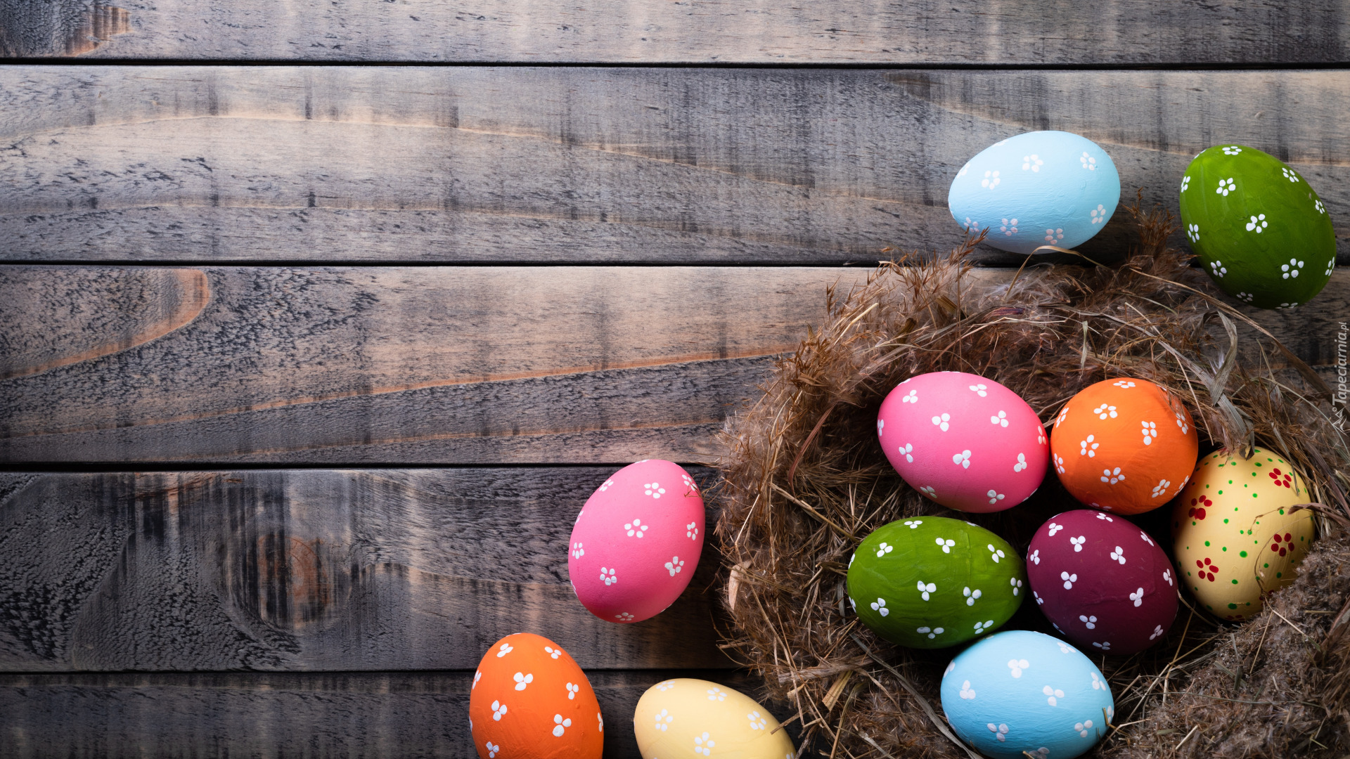 Edytor tapety: Kolorowe pisanki w gnieździe na deskach