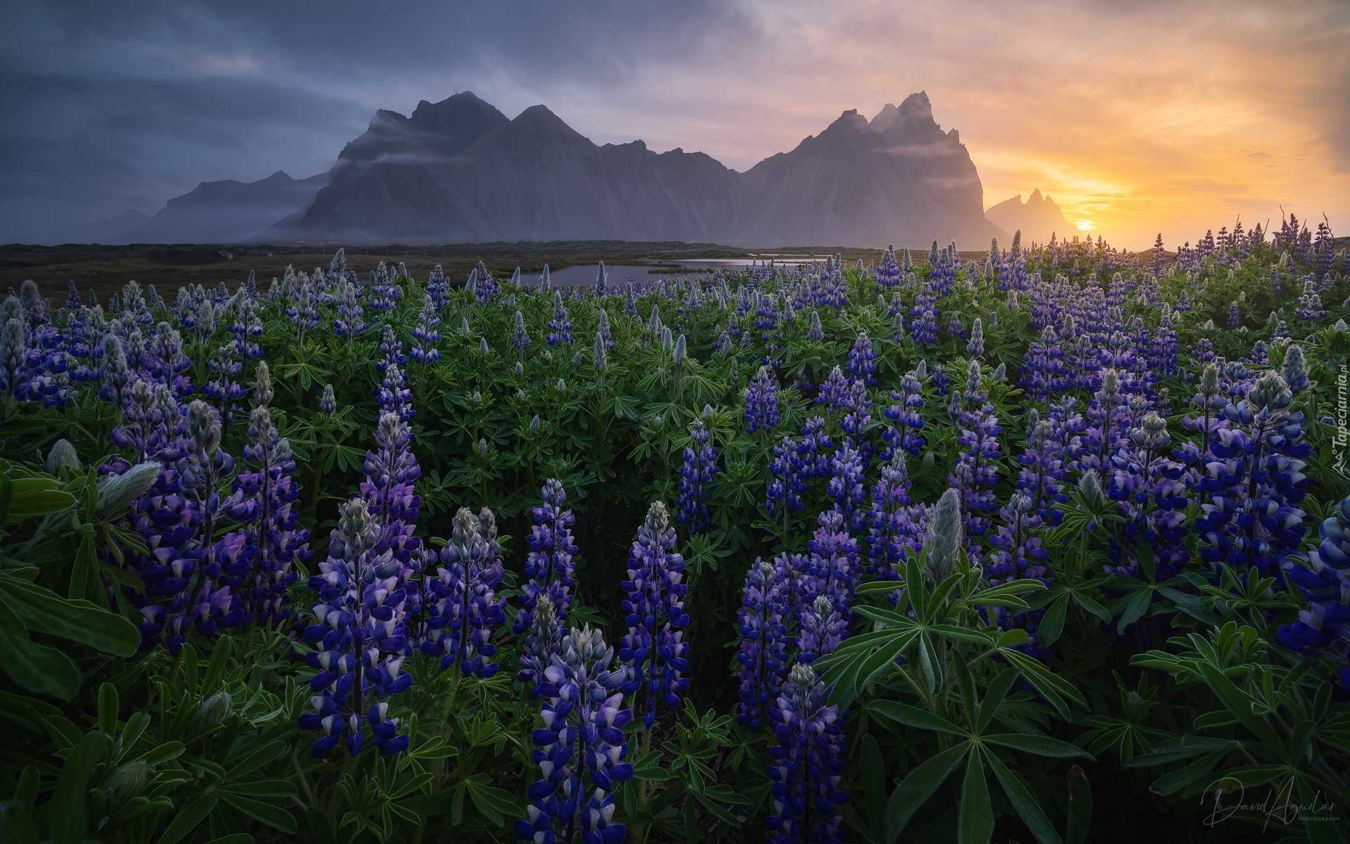 Edytor tapety: Łubinowa łąka i góry w blasku słońca