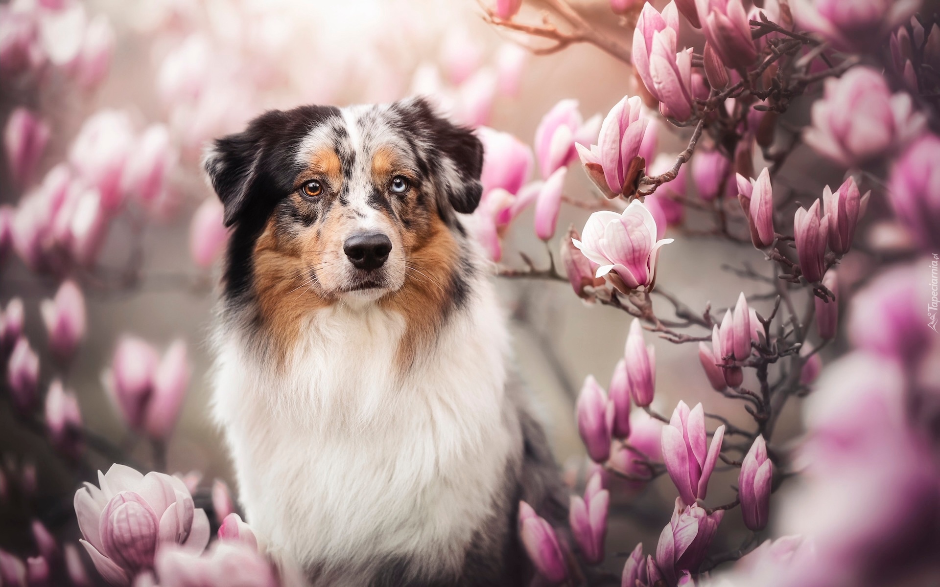 Edytor tapety: Owczarek australijski obok kwitnącej magnolii