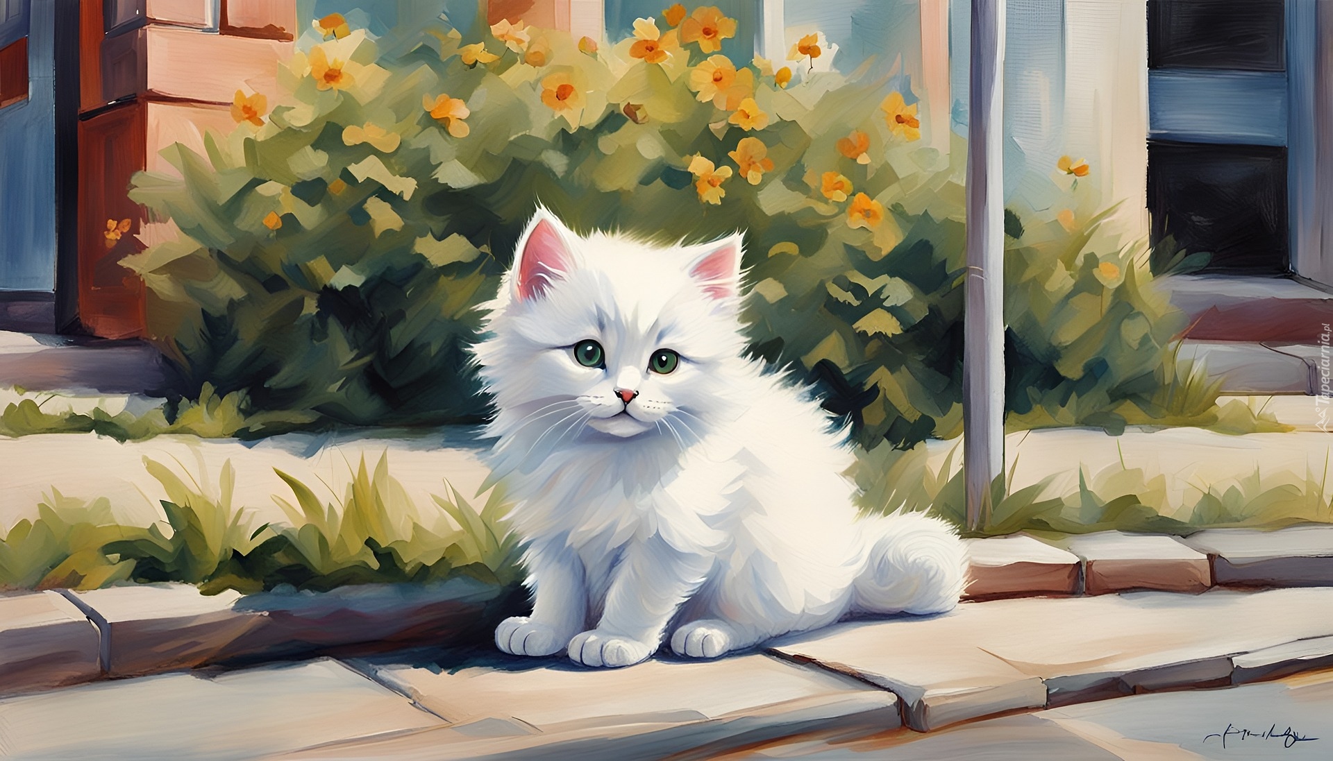 Edytor tapety: Mały biały kotek i kwiaty przed domem