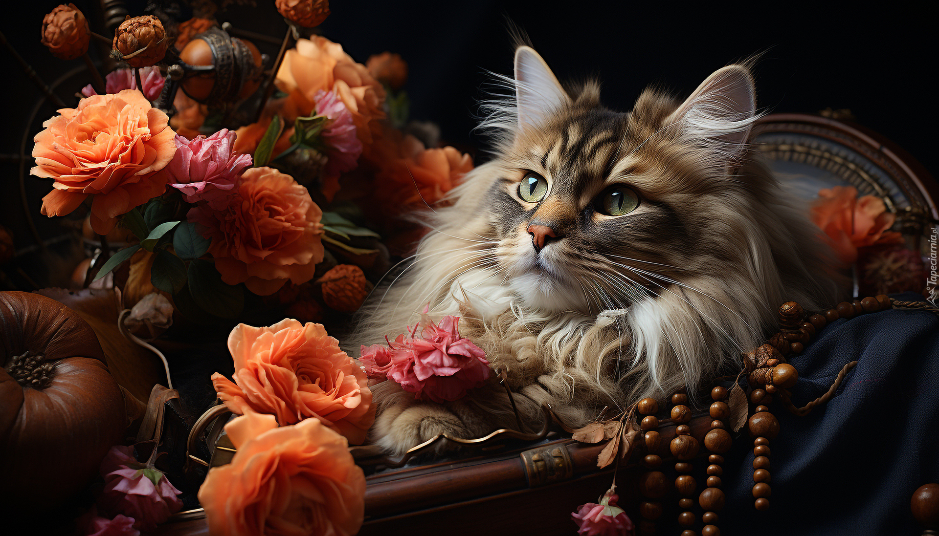 Edytor tapety: Puszysty kot w fotelu obok kwiatów