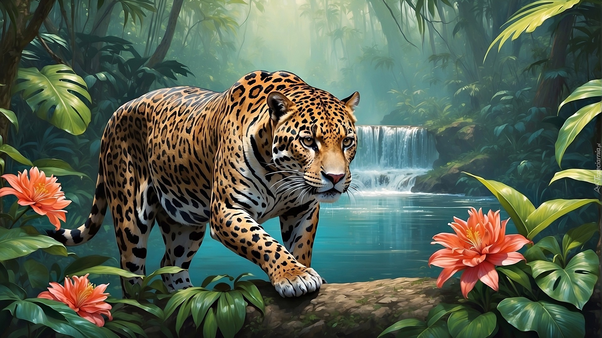 Edytor tapety: Jaguar w rzece z łapą na kłodzie