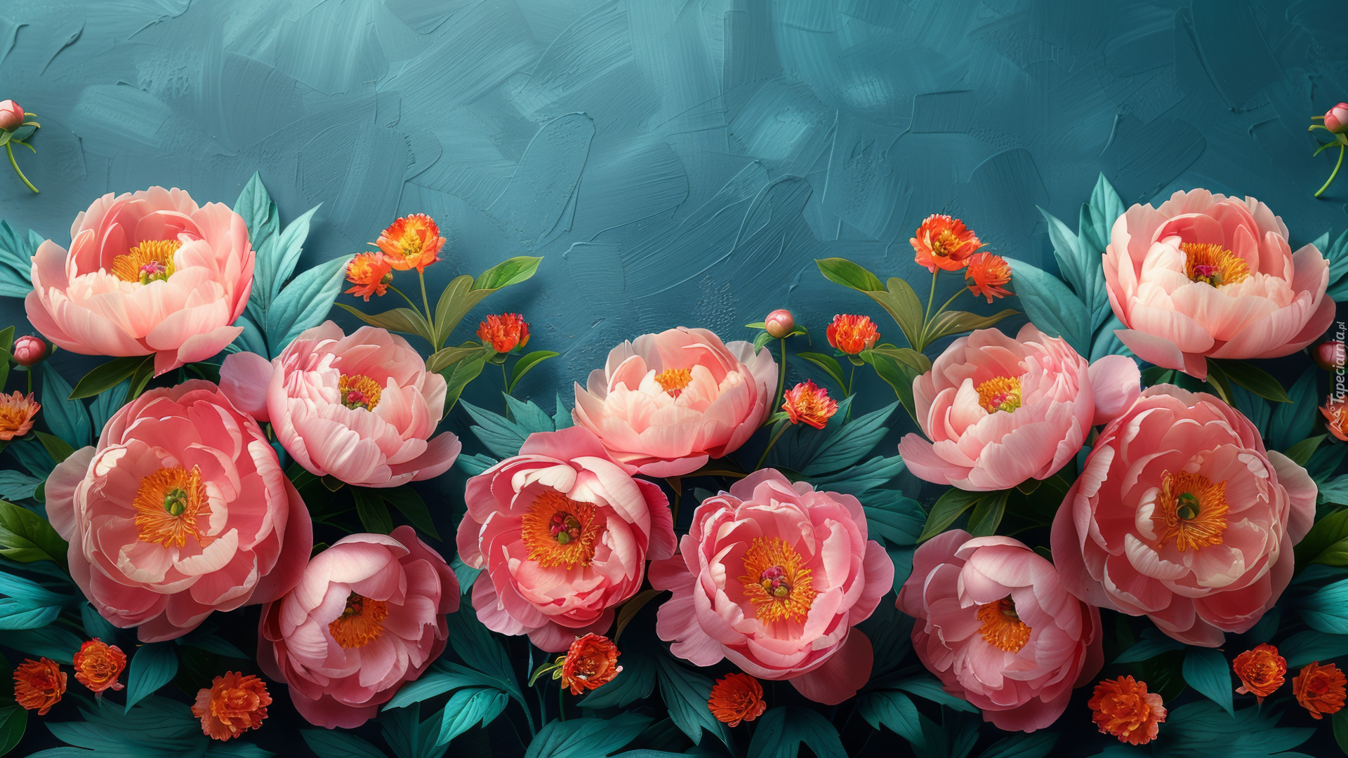 Edytor tapety: Różowe piwonie w rozkwicie na niebieskim tle