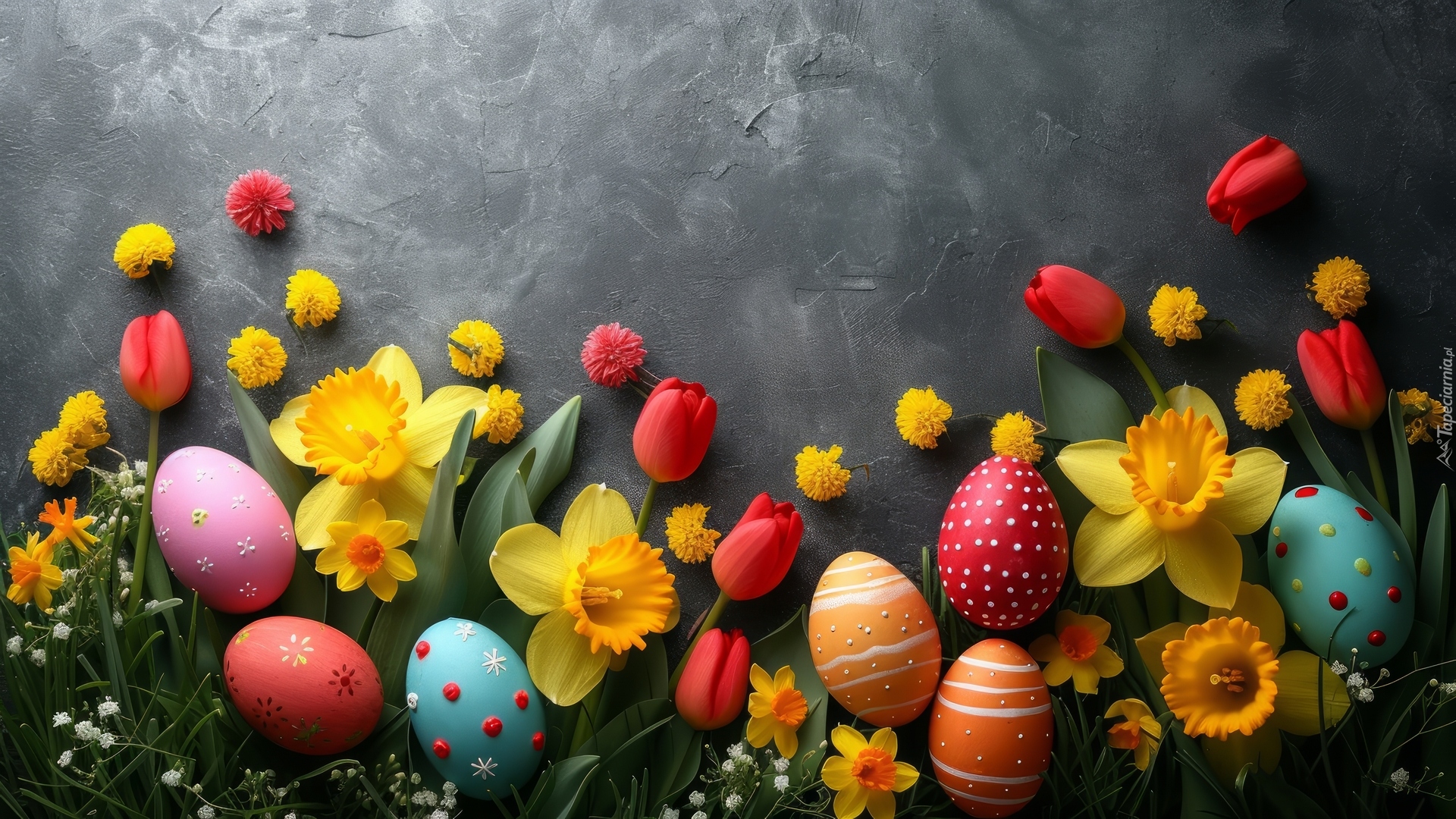 Edytor tapety: Kolorowe pisanki wśród tulipanów i żonkili