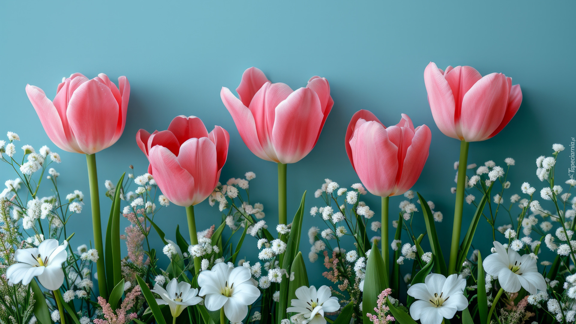 Edytor tapety: Różowe tulipany wśród białych kwiatuszków