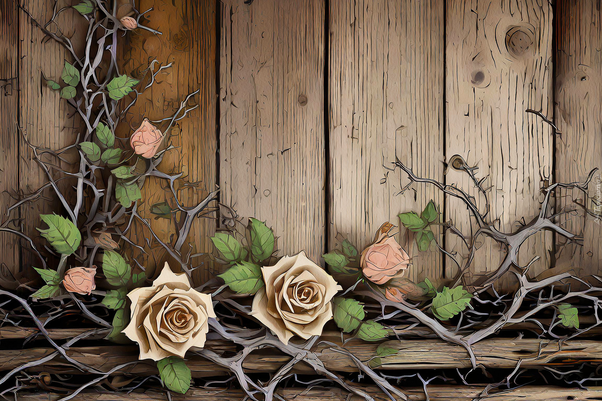 Edytor tapety: Róże i suche konary przy deskach