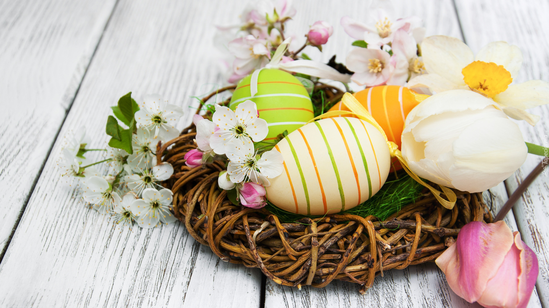 Edytor tapety: Kwiaty i pisanki w gniazdku na deskach