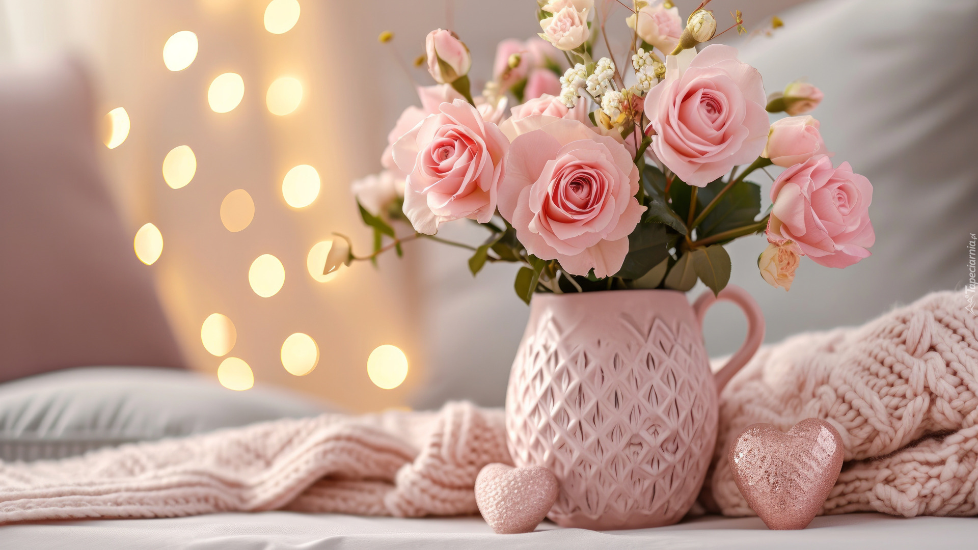 Edytor tapety: Różowe róże w dzbanku obok serc i szalika