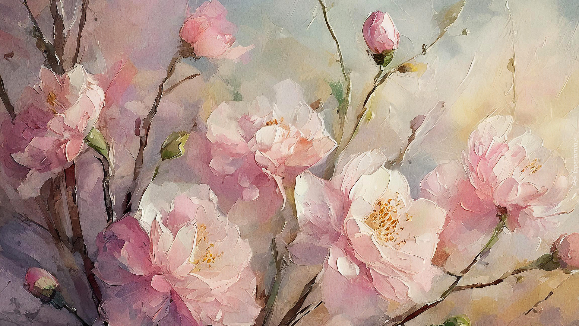 Edytor tapety: Bladoróżowe kwiaty z pąkami w malarstwie