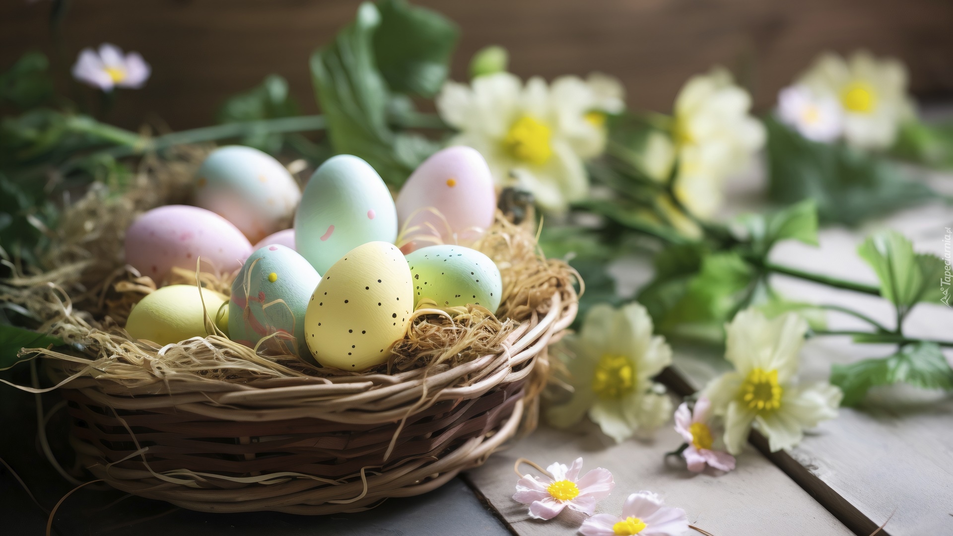Edytor tapety: Koszyk z pisankami obok ukwieconej gałązki