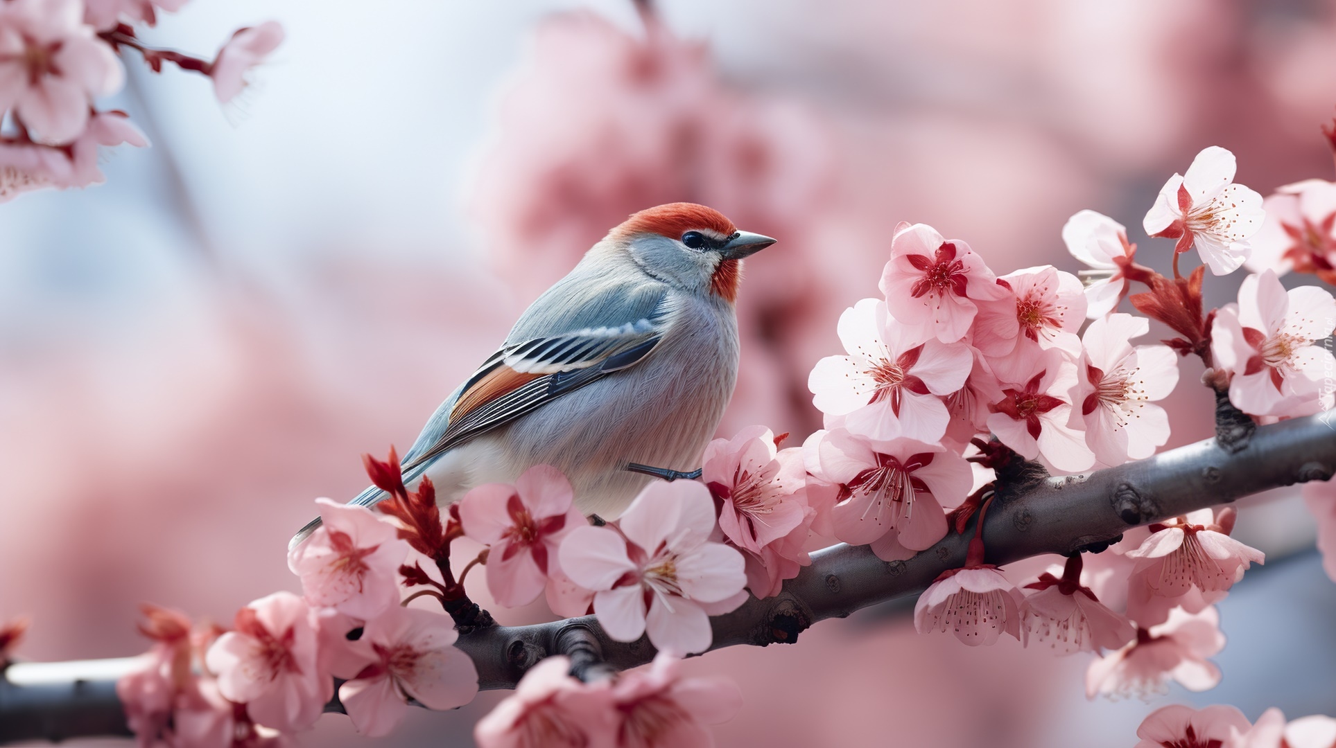 Edytor tapety: Kolorowy ptaszek na ukwieconej gałązce