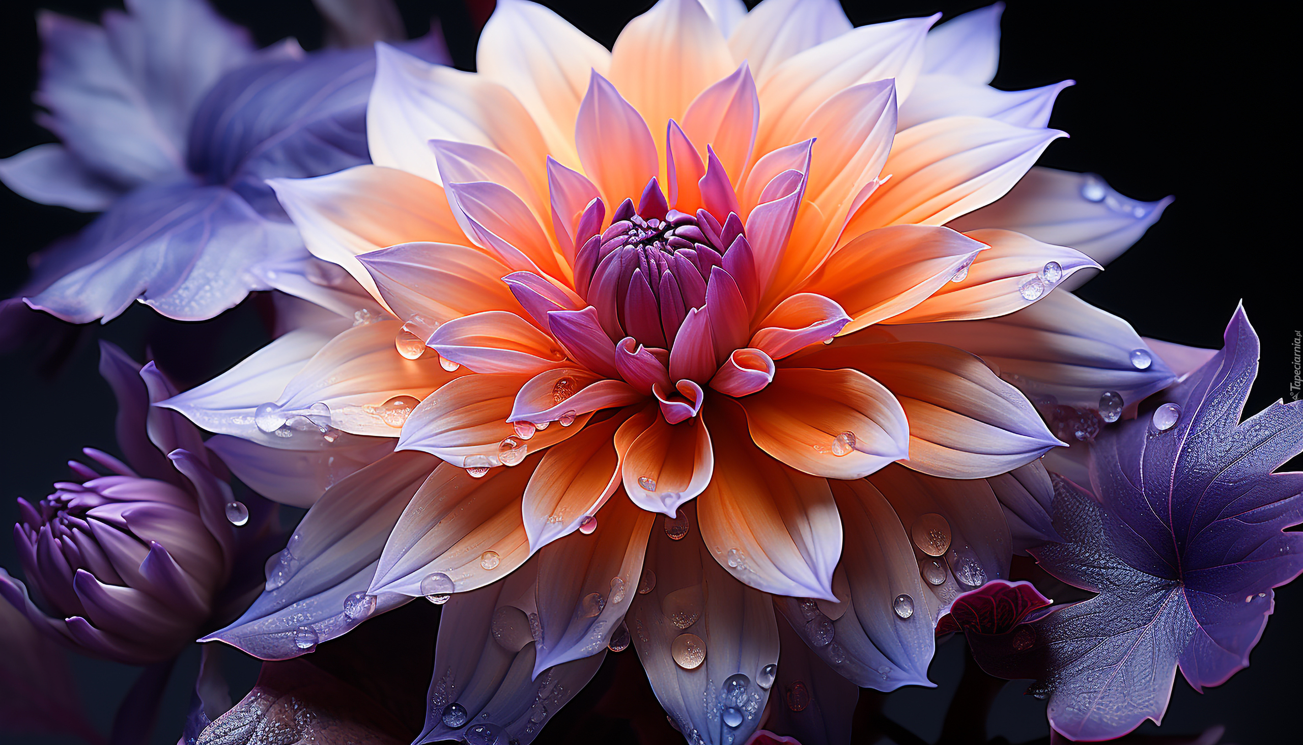 Edytor tapety: Krople na rozkwitniętej kolorowej dalii i liściach