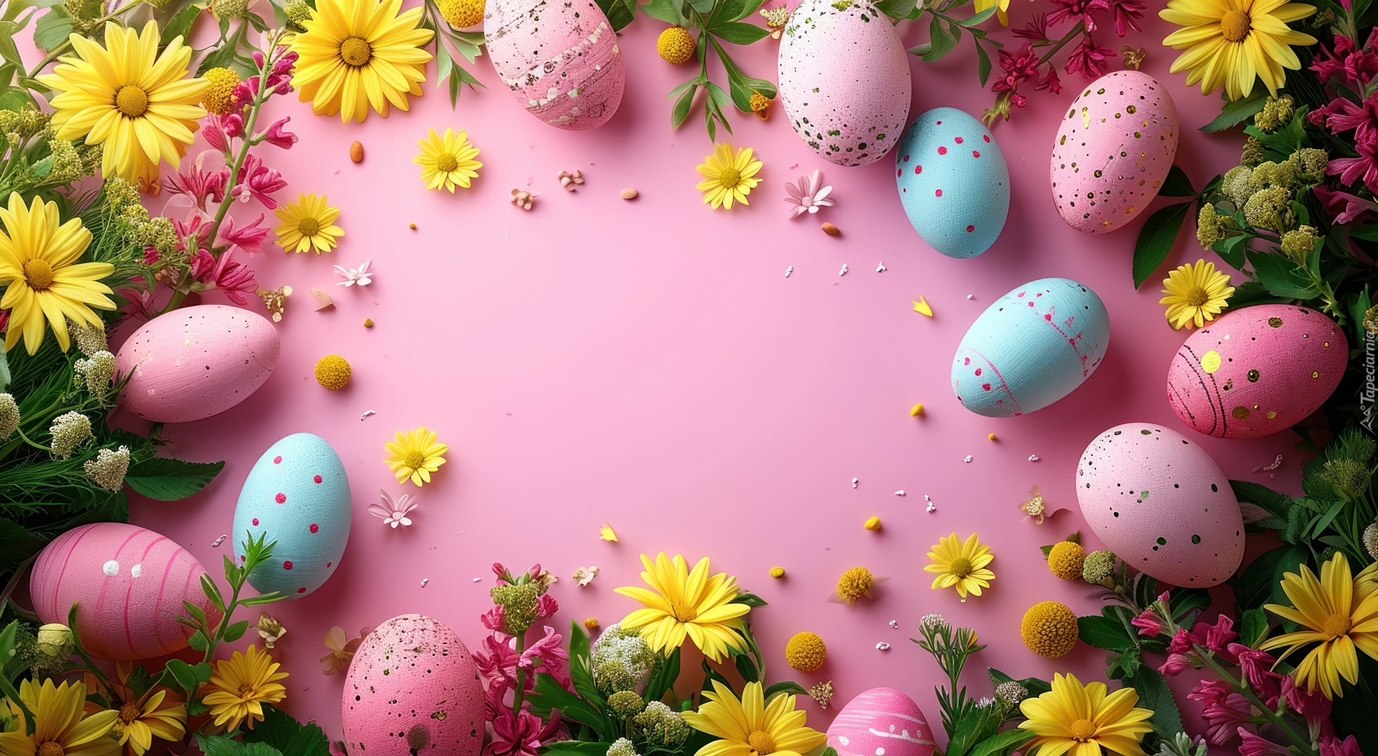 Edytor tapety: Kolorowe pisanki i kwiaty na różowym tle