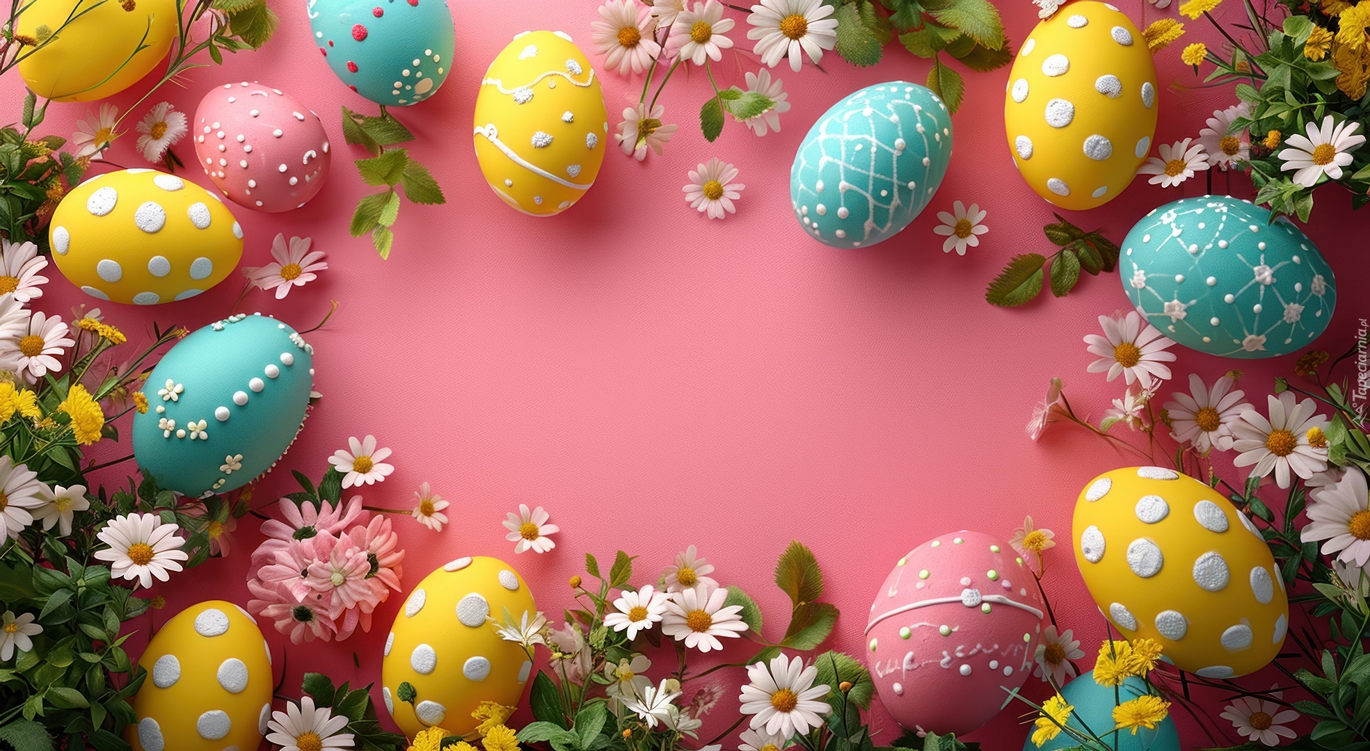 Edytor tapety: Pisanki i drobne białe kwiaty na różowym tle