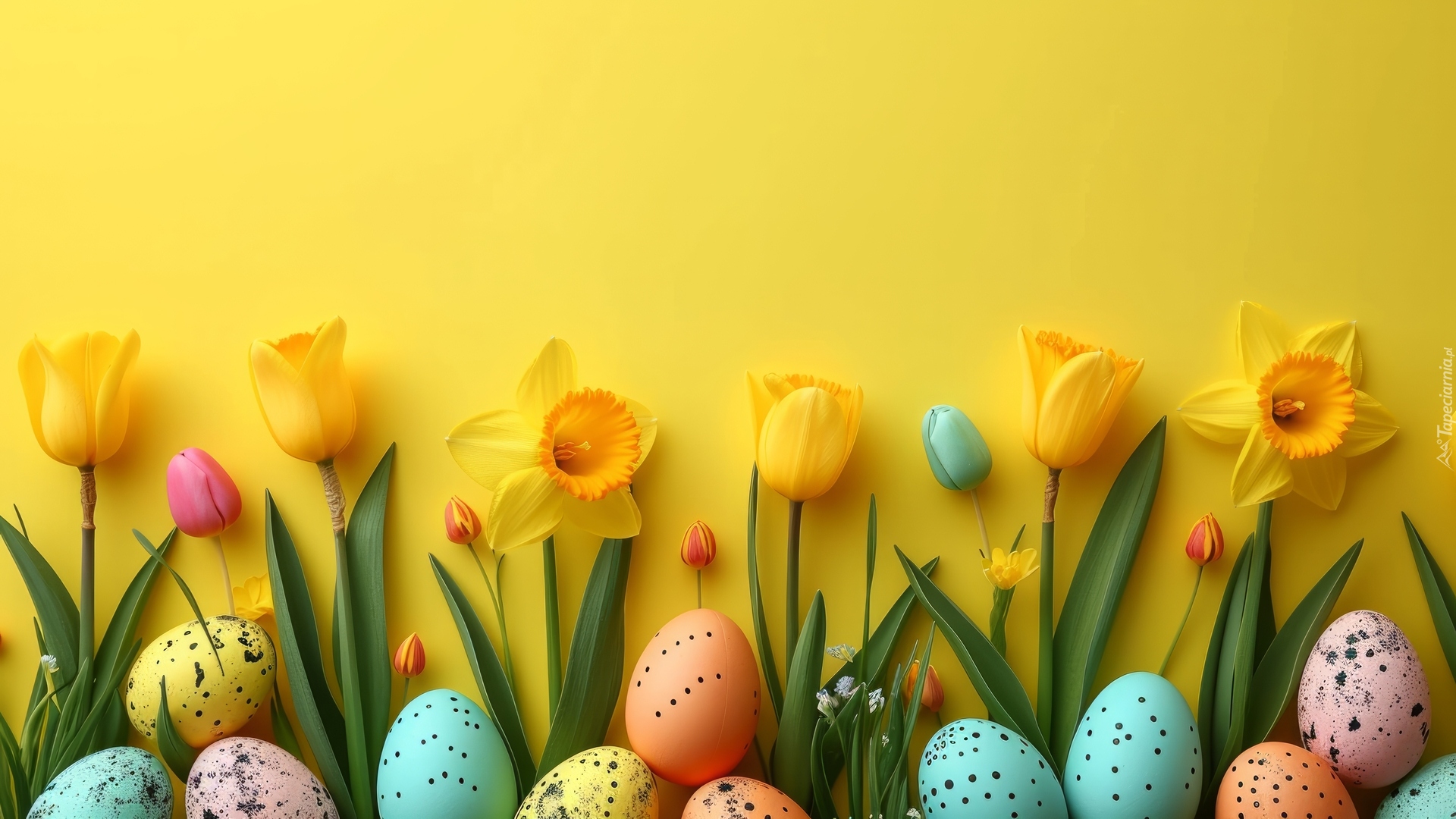 Edytor tapety: Kolorowe pisanki i żonkile na żółtym tle