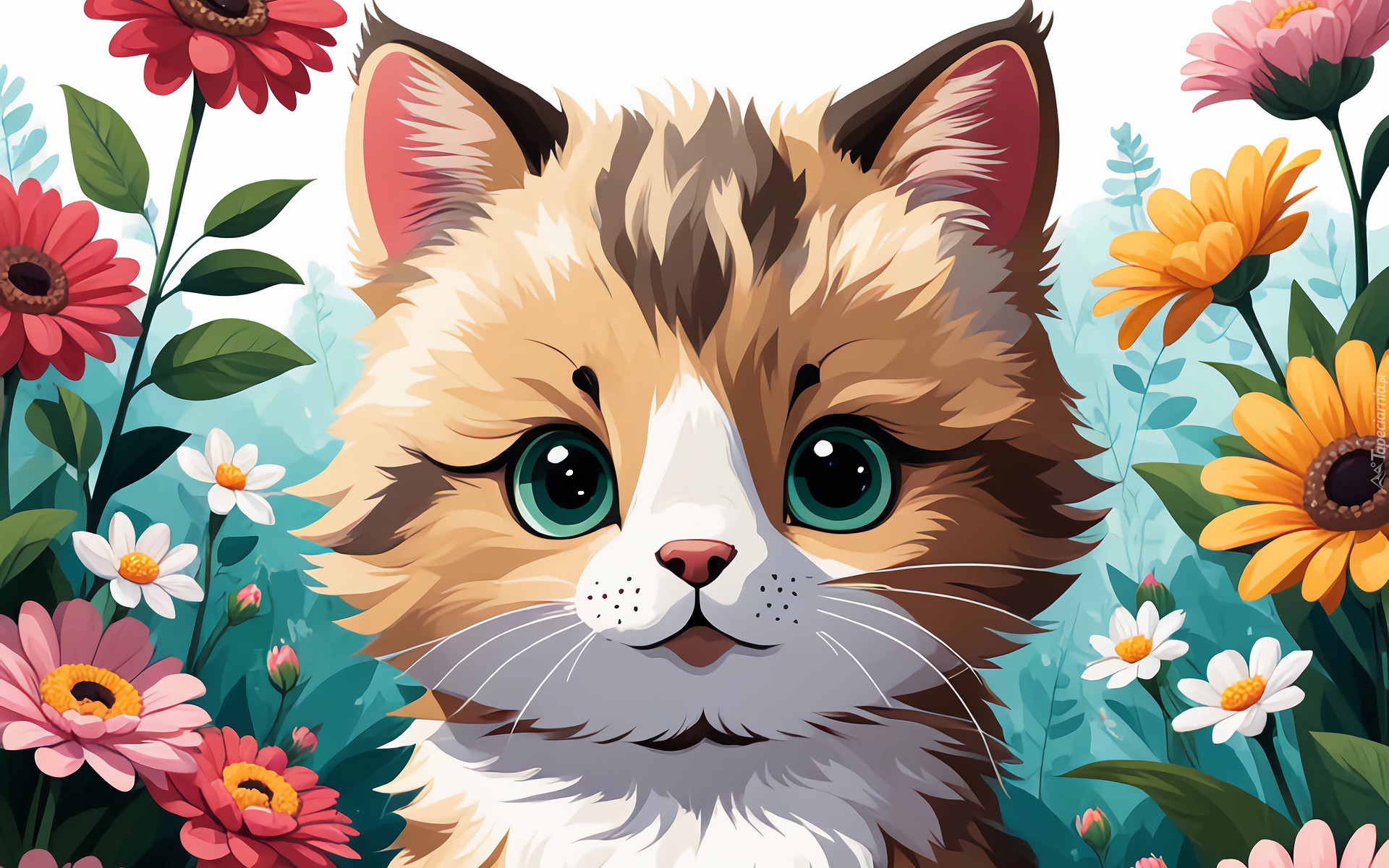 Edytor tapety: Kotek wśród kwiatów w grafice