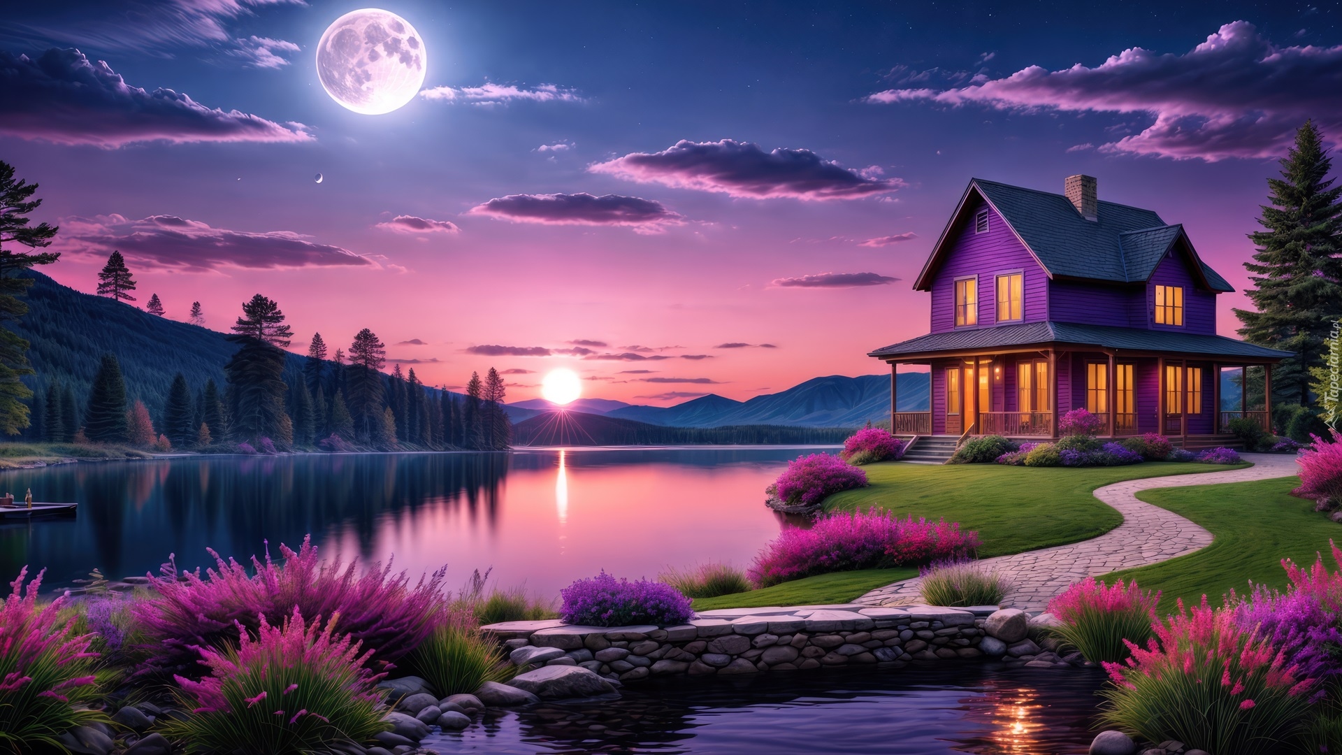 Edytor tapety: Dom nad jeziorem w blasku księżyca