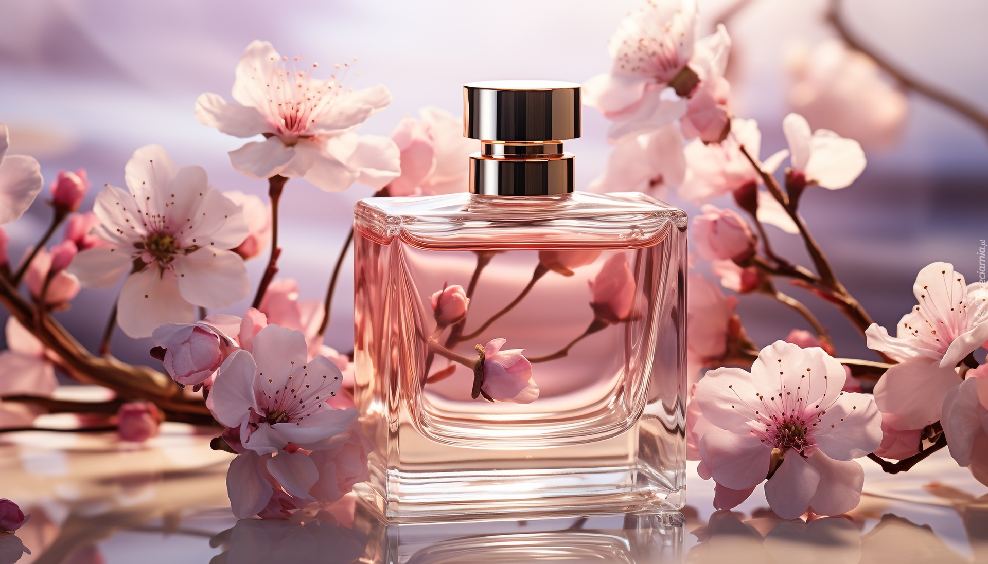 Edytor tapety: Flakon z perfumami i okwiecone gałązki